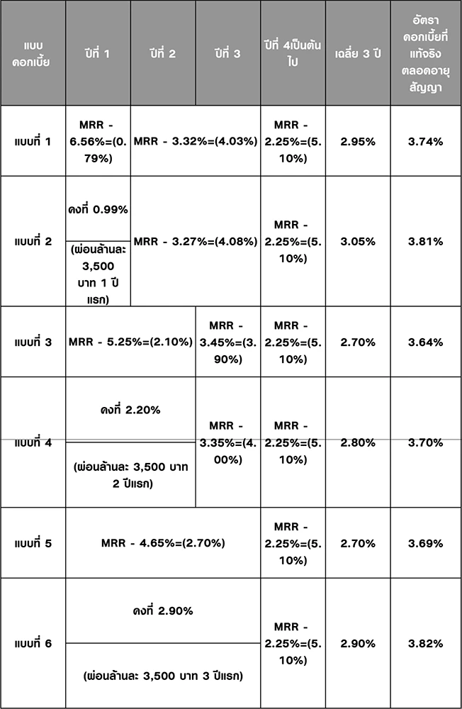 - ลูกค้าสามารถเลือกใช้อัตราการผ่อนชำระขั้นต่ำล้านละ 3,500 บาท ได้ในแบบอัตราดอกเบี้ยแบบคงที่เท่านั้น