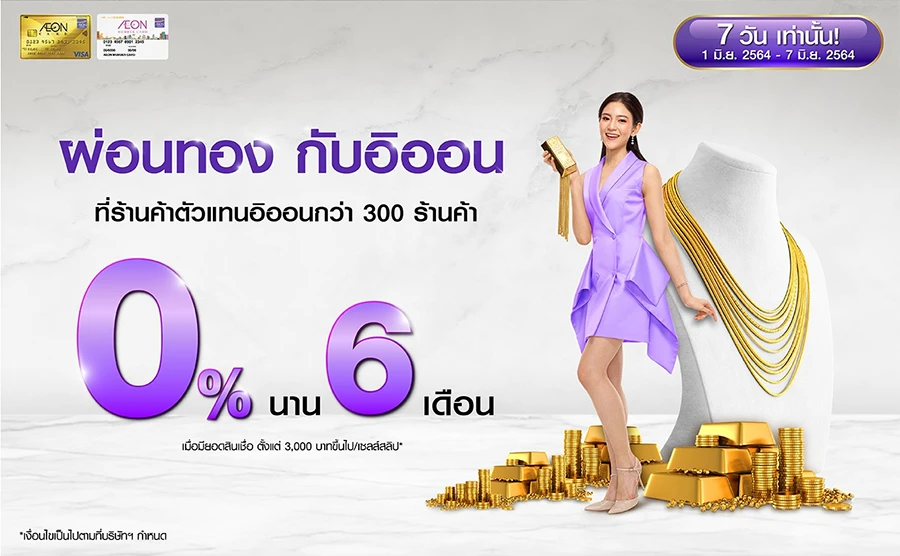 • ผ่อนชำระทองคำ อัตราดอกเบี้ย 0% 6 เดือน สำหรับบริการ "อิออน แฮปปี้ เพย์ และอิออน แฮปปี้ แพลน" เมื่อมียอดสินเชื่อตั้งแต่ 3,000 บาทขึ้นไป/เซลส์สลิป
