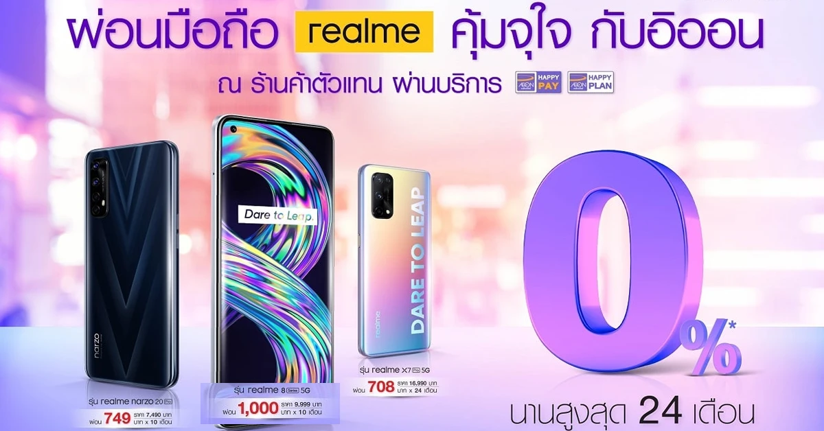 ผ่อนมือถือ REALME ดอกเบี้ย 0% นาน สูงสุด 24 เดือน ณ ร้านค้าตัวแทนที่ร่วมรายการ