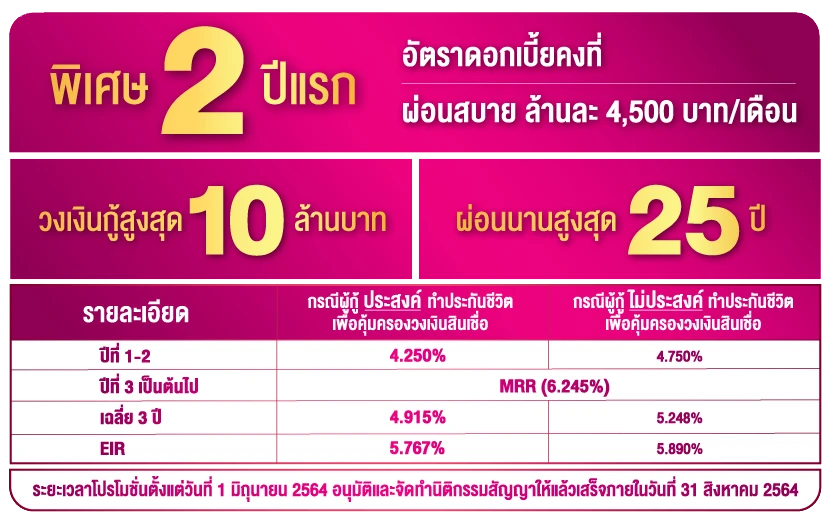 • กรณีผ่อนต่ำล้านละ 4,500 บาท เฉพาะลูกค้าที่เลือกใช้อัตราดอกเบี้ยโปรโมชั่น และมีระยะเวลาตามสัญญากู้มากกว่า 2 ปี