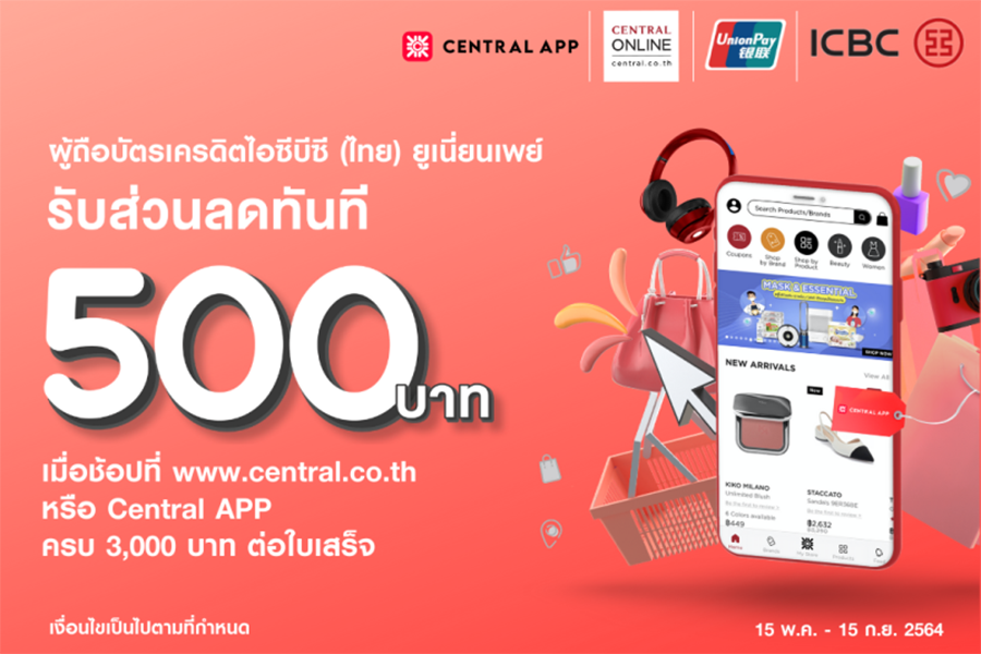 สิทธิพิเศษเฉพาะผู้ถือ บัตรเครดิตไอซีบีซี (ไทย) ยูเนี่ยนเพย์  รับส่วนลดทันที 500* บาท เมื่อช้อปที่เซ็นทรัล ออนไลน์ www.central.co.th หรือ Central APP ครบ 3,000 บาทต่อใบเสร็จ