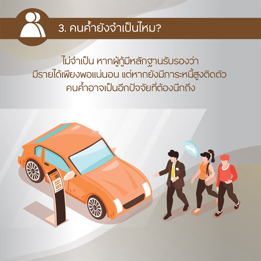 3. คนค้ำยังจำเป็นไหม สิ่งนี้ต้องถามตัวเองให้แน่ใจว่ามีความสามารถพอกับภาระหนี้ต่อเดือนหรือไม่ เพราะสถาบันการเงินยุคนี้มองที่ตัวบุคคลเป็นหลัก เงื่อนไขไฟแนนซ์ปรับเปลี่ยนได้ตามโปรไฟล์ผู้กู้ หากมีรายได้หลายทาง ทำงานหลายอาชีพ จะงานประจำหรืองานฟรีแลนซ์ มีรายได้เพียงพอแน่นอน ยื่นไฟแนนซ์ไป ยังไงคนค้ำก็ไม่จำเป็น แต่หากคุณยังมีภาระหนี้ค่อนข้างสูงเมื่อเทียบกับรายได้ การมีคนค้ำประกันก็อาจเป็นอีกปัจจัยที่ต้องนึกถึงเมื่อต้องเช่าซื้อรถ