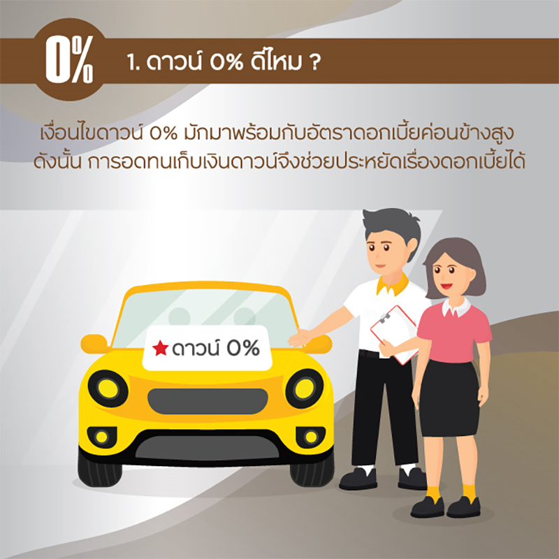1. ดาวน์ 0% ดีไหม แน่นอนว่าเมื่อเห็นโปรโมชันดาวน์ 0% มักล่อตาล่อใจ เพราะออกรถได้โดนไม่ต้องใช้เงินสักบาท แต่อย่าลืมคิดถึงค่างวดผ่อนชำระต่อเดือนที่อาจสูงลิบ เพราะอัตราดอกเบี้ยค่อนข้างสูง และจะคิดดอกเบี้ยจากราคารถทั้งหมด รวมถึงส่วนใหญ่มักให้ผ่อนชำระไม่เกิน 48 งวด ลองคิดเล่นๆ หากซื้อรถราคา 600,000 บาท ด้วยเงื่อนไขดาวน์ 0% ผ่อน 48 เดือน ค่างวดรถจะอยู่ที่ 14,995 บาท* แต่ถ้าหากอดทนเก็บเงินดาวน์อีกสักนิด และวางเงินดาวน์ 25% จะทำให้อัตราดอกเบี้ยถูกลง และค่างวดรถจะอยู่ที่ 10,233 บาท* เรียกว่าเหลือเงินค่างวดไปทำอย่างอื่นได้สบาย