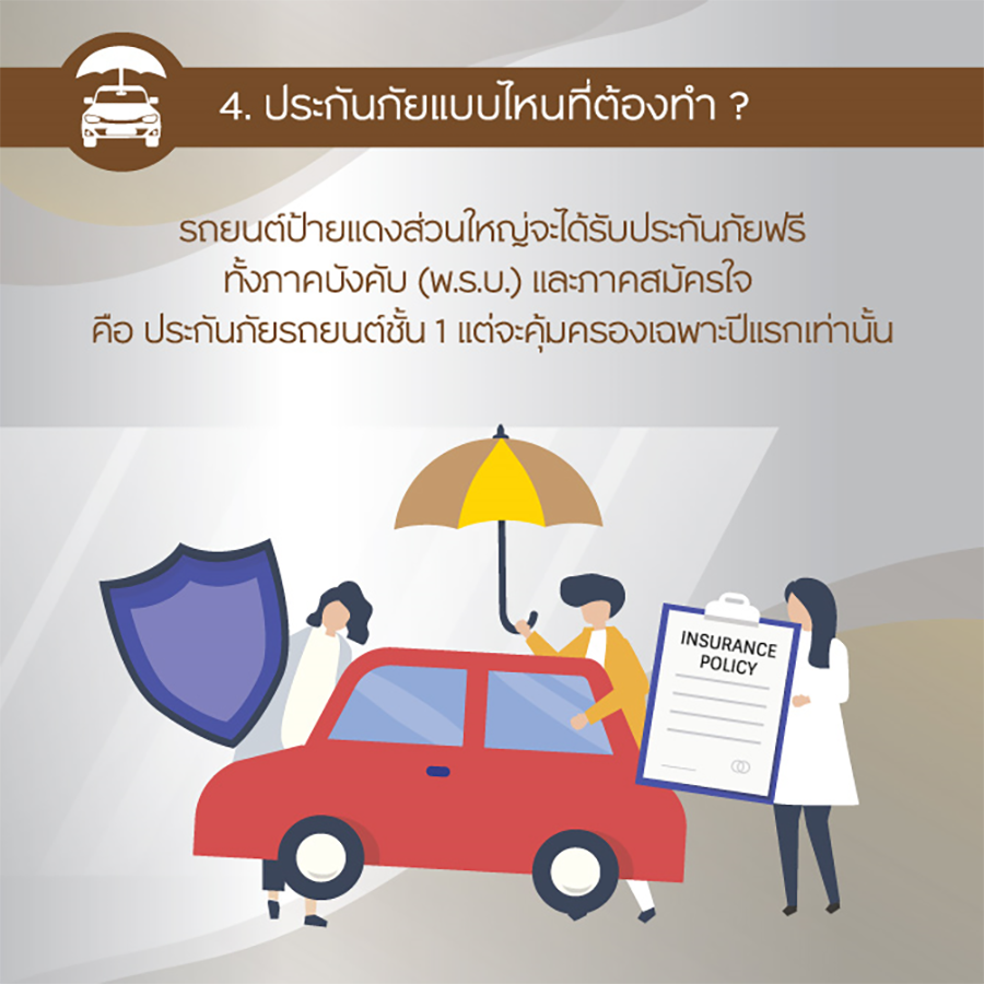 4. ประกันภัยแบบไหนที่ต้องทำ เมื่อเป็นมือใหม่ ประกันภัยเป็นเรื่องสำคัญ โดยปกติเมื่อซื้อรถยนต์ป้ายแดง ผู้เช่าซื้อจะได้รับประกันภัยทั้งภาคบังคับตามกฏหมาย (พ.ร.บ.) และภาคสมัครใจ คือ ประกันภัยรถยนต์ชั้น 1 ระยะเวลาคุ้มครอง 1 ปี เป็นของแถมให้อยู่แล้ว แต่เมื่อขึ้นปีที่สอง จะต้องจ่ายเบี้ยต่อประกันภัยเอง ซึ่งประกันภัย พ.ร.บ. ที่เป็นภาคบังคับนั้น อยู่ที่ 645.21 บาท ราคาเดียวทุกรุ่น ทุกแบรนด์ ส่วนประกันภัยภาคสมัครใจ สามารถเลือกประเภทหรือรูปแบบความคุ้มครองได้เองตามต้องการ นอกจากนี้ ใครที่อยากอุ่นใจเพิ่มขึ้น สามารถเลือกประกันคุ้มครองวงเงินสินเชื่อ (PPI) เพิ่มเติมไว้อีกฉบับก็ได้ โดยบริษัทประกันจะรับผิดชอบการชำระค่างวดที่เหลือทั้งหมด ในกรณีที่ผู้กู้ทุพพลภาพหรือเสียชีวิต แต่ประกัน PPI จะต้องทำไว้ตั้งแต่เริ่มสัญญาเช่าซื้อเท่านั้น