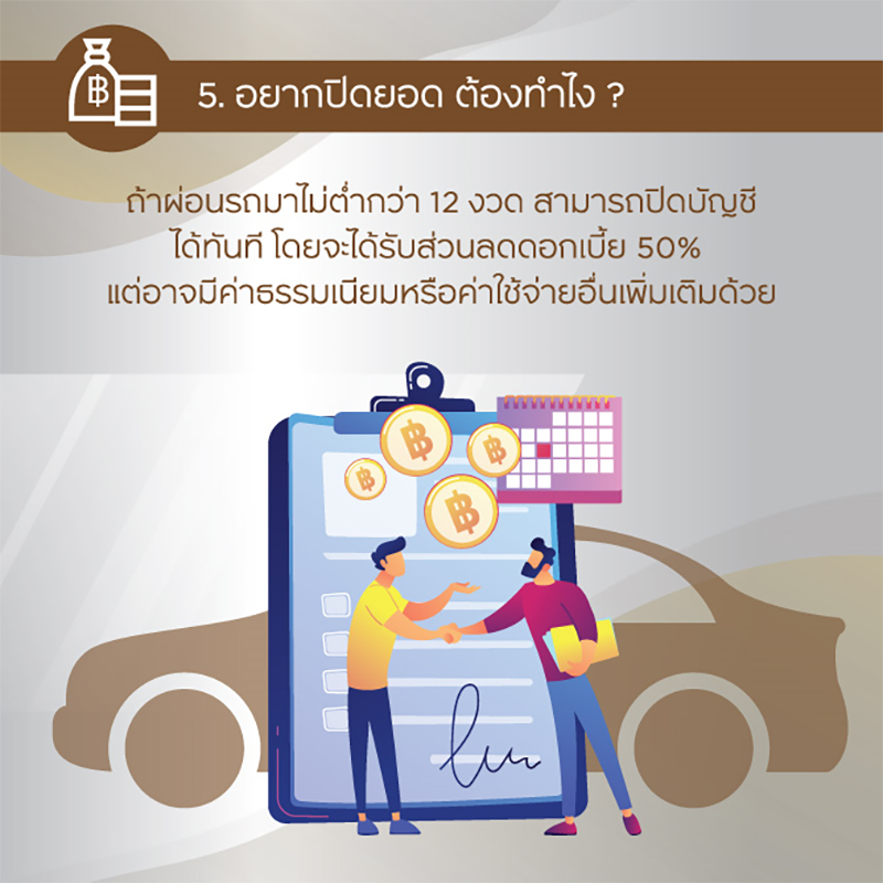 5. อยากปิดยอด ต้องทำไง หากใครที่มั่นใจว่าผ่อนมาแล้วไม่ต่ำกว่า 12 งวด อย่าคิดว่าไฟแนนซ์รถเป็นสิ่งที่จะอยู่กับเราไปตลอดจนถึงวันสิ้นสุดสัญญา เพราะอยากปิดบัญชีเมื่อไหร่ ทำได้ทันที และยังได้รับส่วนลดดอกเบี้ย 50% ของดอกเบี้ยเช่าซื้อแบบลดต้นลดดอกที่ยังไม่ถึงกำหนดชำระอีกด้วย แต่แนะนำให้เช็กยอดรวมที่ต้องชำระเมื่อวันปิดบัญชีที่แน่นอนก่อน อาจมีค่าใช้จ่ายอื่นๆ เช่น ยอดภาษีมูลค่าเพิ่ม ยอดค้างชำระ หรือค่าธรรมเนียม รวมอยู่ด้วย จะได้ประเมินว่าเงินที่เตรียมไว้ปิดยอด เพียงพอหรือไม่