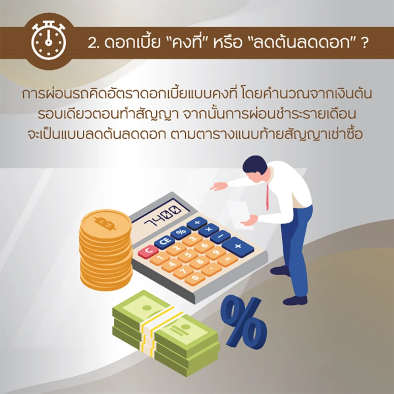 2. ดอกเบี้ย "คงที่" หรือ "ลดต้นลดดอก" กันแน่ ตามหลักเกณฑ์แล้วการเช่าซื้อรถ มีการคิดคำนวณอัตราดอกเบี้ยเงินต้นแบบ "คงที่" (คิดอัตราดอกเบี้ยที่ต้องชำระทั้งหมดเท่ากันทุกงวด ตั้งแต่วันที่ทำสัญญาจนถึงวันที่ผ่อนเสร็จ) แต่มีการผ่อนชำระดอกเบี้ยแบบ "ลดต้นลดดอก" (จำนวนดอกเบี้ยที่ชำระในแต่ละงวดจะลดลง) ดังนั้น เมื่อผ่อนชำระงวดแรกๆ ยอดเงินที่จ่ายไปส่วนใหญ่จะเป็นดอกเบี้ย และงวดหลังๆ ส่วนใหญ่จะเป็นการชำระเงินคืนต้น จึงไม่ต้องตกใจเมื่อเห็นยอดเงินต้นคงเหลืออยู่เยอะ แม้ว่าจะทยอยผ่อนไปบ้างแล้ว ทั้งนี้ ในการทำสัญญาเช่าซื้อกับสถาบันการเงิน จะมีตารางที่แจกแจงค่างวดและดอกเบี้ยแบบลดต้นลดดอก ไว้อ้างอิงอย่างครบถ้วนอยู่แล้ว