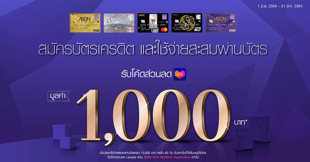- รับโค้ดส่วนลด 1,000 บาท (500 บาทจำนวน 2โค้ด) ผ่าน AEON THAI MOBILE Application เมื่อมียอดใช้จ่ายผ่านบัตรเครดิตอิออน เจ-พรีเมียร์ แพลทินัม ,บัตรเครดิตอิออน โกลด์ ,บัตรเครดิตอิออน คลาสสิค ,บัตรเครดิตอิอนยูเนี่ยนเพย์ แพลทินัม และบัตรเครดิตอิออนแรบบิท แพลทินัม (ไม่รวมค่าขนส่ง) โดยนำโค้ดส่วนลดไปใช้ที่เว็บไซต์ หรือแอปพลิเคชันลาซาด้าเท่านั้น