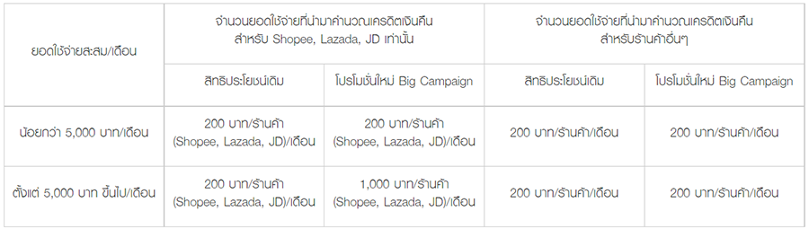 - สำหรับผู้ถือบัตรมียอดใช้จ่ายสะสมตั้งแต่ 5,000 บาทขึ้นไป/เดือน ธนาคารจะเครดิตเงินคืน 15% ตามยอดใช้จ่ายที่ใช้ที่เกิดขึ้นจริง โดยจำกัดยอดใช้จ่ายที่นำมาคำนวณเครดิตเงินคืน 1,000 บาท/ร้านค้า Shopee/ร้านค้า Lazada/ หรือร้านค้า JD / บัตรหลัก / เดือน หรือจำกัดยอดเครดิตเงินคืน 150 บาท /ร้านค้า Shopee/ร้านค้า Lazada/ หรือ ร้านค้า JD / บัตรหลัก / เดือน และจำกัดยอดใช้จ่ายที่นำมาคำนวณเครดิตเงินคืน 200 บาท/ร้านค้าอื่นๆ/เดือน หรือ จำกัดยอดเครดิตเงินคืน 30 บาท/ร้านค้าอื่นๆ/บัตรหลัก/ เดือน และ รวมยอดเครดิตเงินคืนทั้งหมดไม่เกิน 450 บาท/บัตรหลัก/เดือน ทุกร้านค้า