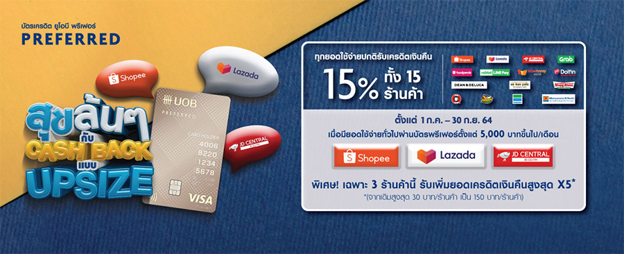 สิทธิพิเศษสำหรับผู้ถือบัตรเครดิตยูโอบี พรีเฟอร์ รับเพิ่ม ยอดเครดิตเงินคืน X5* สำหรับยอดใช้จ่ายที่ Shopee, Lazada และ JD เมื่อมียอดใช้จ่ายอื่นๆ สะสมต่อเดือนผ่านบัตรฯ ตั้งแต่ 5,000 บาท ขึ้นไป (*จากเดิมสูงสุด 30 บาท/ร้านค้า เป็น 150 บาท/ร้านค้า)