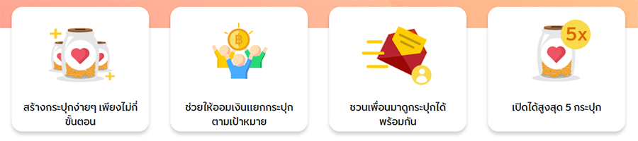 - อยากชวนใครมาดูกระปุกนี้ด้วยกัน? : ชวนเพื่อนหรือคนในครอบครัวเข้ามาเป็นส่วนหนึ่งของกระปุกของคุณนี้ ความสำเร็จจะใกล้ขึ้น เป้าหมายเก็บเงินจะใหญ่แค่ไหน เป็นไปได้ถ้าทำด้วยกัน
