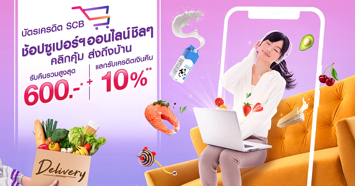 สิทธิพิเศษสำหรับลูกค้าผู้ถือบัตรเครดิตธนาคารไทยพาณิชย์ อยู่บ้านช้อปซูเปอร์ฯ ออนไลน์ รับเงินคืนสูงสุด 600 บาท + แลกรับเงินคืน 10% ที่ Big C Shopping Online, Foodland Online Shopping, Lotus Online, Tops Online และ Villa Market Online