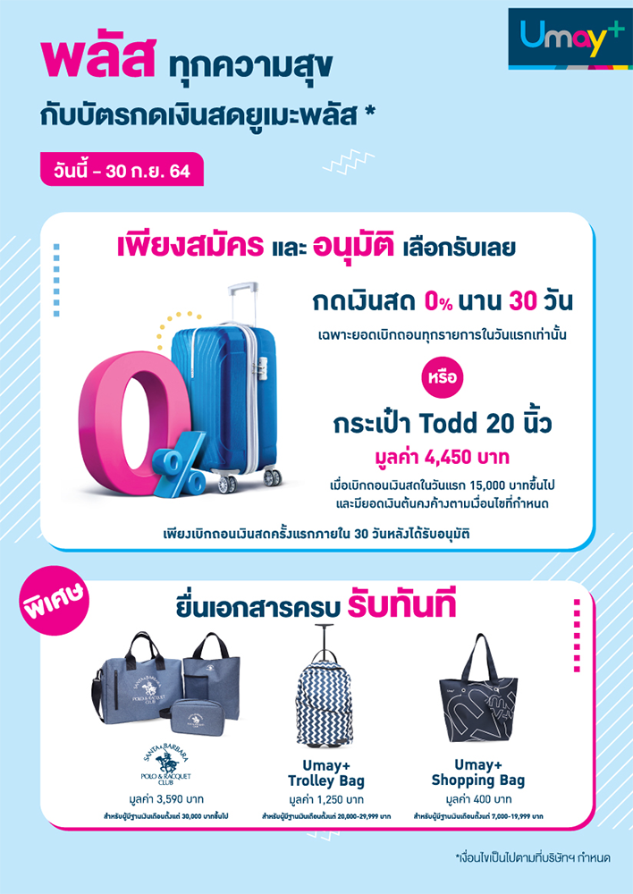 สมัครบัตรกดเงินสดยูเมะพลัสและอนุมัติ เพียงลูกค้าทำรายการเบิกถอนเงินสดภายใน 30 วันหลังได้รับการอนุมัติ ผ่านทุกช่องทางบริการของบริษัทฯ เลือกรับเลย อัตราดอกเบี้ยพิเศษ 0% นาน 30วัน สำหรับยอดเบิกถอนเงินสดทุกรายการภายในวันแรก หรือ รับกระเป๋าเดินทางล้อลาก Todd สุดคูล! ขนาด 20 นิ้ว มูลค่า 4,450 บาท สำหรับยอดเบิกถอนเงินสดตั้งแต่ 15,000 บาทขึ้นไป และมียอดเงินต้นคงค้าง 10,000 บาท ทุกวัน เป็นเวลา 30 วัน พลัสยิ่งกว่า! เมื่อยื่นเอกสารการสมัครครบถ้วน รับทันทีของพรีเมี่ยมสุดพิเศษ สำหรับผู้ที่มีฐานเงินเดือนตั้งแต่ 7,000 - 19,999 บาท รับ กระเป๋า Umay+ Shopping Bag มูลค่า 400 บาท สำหรับผู้ที่มีฐานเงินเดือนตั้งแต่ 20,000 - 29,999 บาท รับ กระเป๋า Trolley Bag มูลค่า 1,250 บาท และสำหรับผู้ที่มีฐานเงินเดือนตั้งแต่ 30,000 บาทขึ้นไป รับ กระเป๋า SANTA BARBARA POLO & RACQUET CLUB มูลค่า 3,590 บาท ห้ามพลาด!! วันนี้ - 30 กันยายน 2564 เท่านั้น อัตราดอกเบี้ยและค่าธรรมเนียมการใช้วงเงินไม่เกิน 25% ต่อปี, อนุมัติวงเงินไม่เกิน 5 เท่าของรายได้ เงื่อนไขเป็นไปตามที่บริษัทฯ กำหนด สอบถามเพิ่มเติม ณ สาขา และจุดบริการยูเมะพลัสทั่วประเทศ หรือติดต่อลูกค้าสัมพันธ์ โทร 0 2695 0000