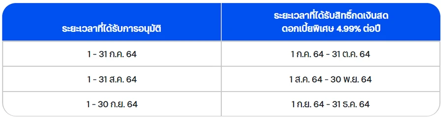 - การคำนวณอัตราดอกเบี้ยพิเศษ 4.99% ต่อปี ของลูกค้าแต่ละราย ต้องเป็นการกดใช้เงินภายในระยะเวลาที่ได้รับสิทธิ์ตามตารางเท่านั้น และอาจมีจำนวนวันที่ใช้ในการคำนวณอัตราดอกเบี้ยพิเศษ ในรอบบัญชีแรกไม่ครบ 30 วันขึ้นอยู่กับวันที่ได้รับอนุมัติ และวันที่สรุปรอบบัญชีของลูกค้าแต่ละรายเป็นสำคัญ
