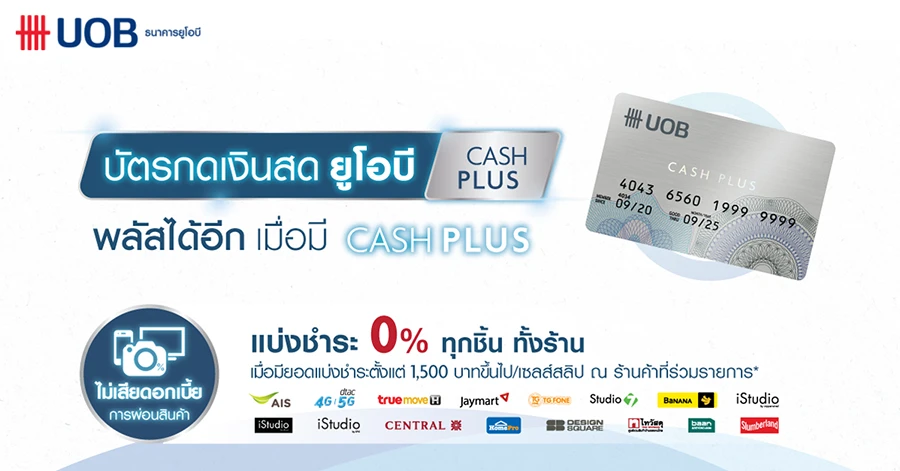 บัตรกดเงินสดยูโอบี แคชพลัส - แบ่งชำระ 0% ทุกชิ้น ทั้งร้าน เมื่อมียอดแบ่งชำระตั้งแต่ 1,500 บาทขึ้นไป/เซลส์สลิป ณ ร้านค้าที่ร่วมรายการ