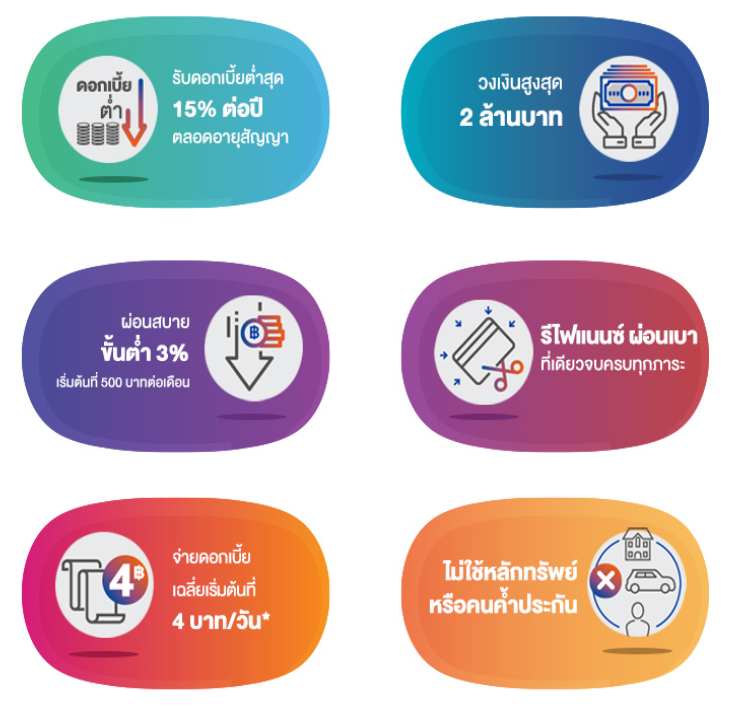 - รีไฟแนนซ์ผ่อนเบา ไม่ว่าจะหนี้บัตรเครดิต หรือบัตรกดเงินสด รวมหนี้ไว้ที่เดียวจบครบทุกภาระ