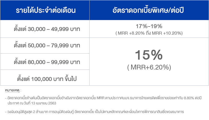 - รายได้ประจำตั้งแต่ 30,000 บาทขึ้นไป (ประกอบด้วยเงินเดือน และสามารถรวมรายได้ประจำอื่นๆ ที่ได้รับเท่ากันทุกเดือน)