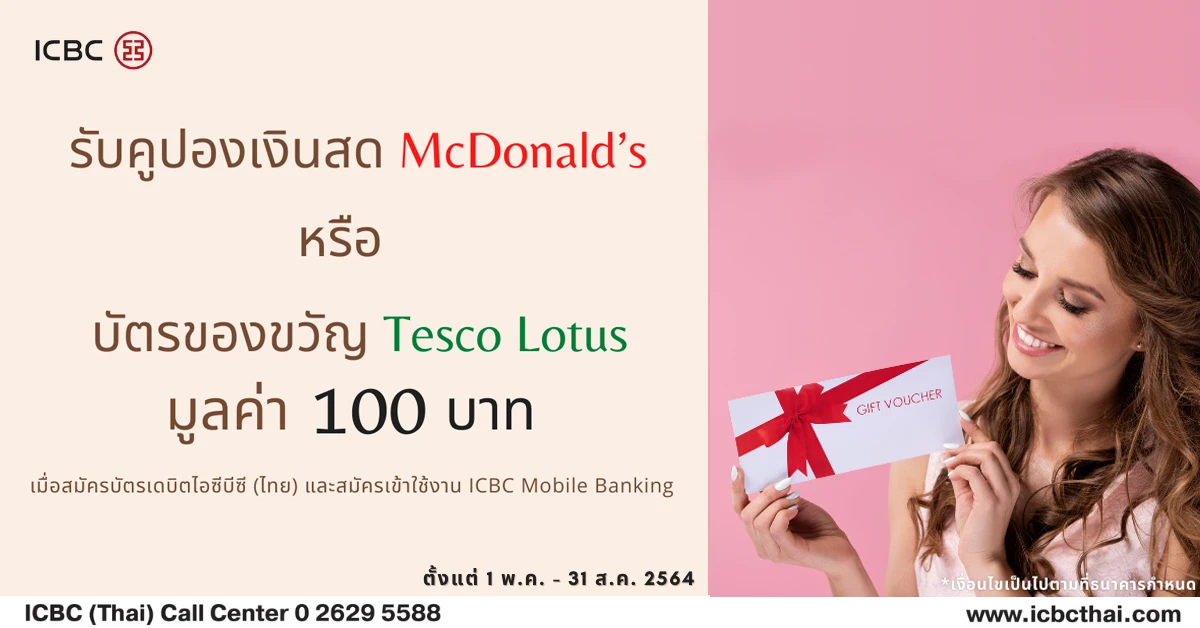 รับคูปองเงินสด McDonald's หรือบัตรของขวัญ Tesco Lotus มูลค่า 100 บาท เมื่อสมัครบัตรเดบิตไอซีบีซี (ไทย) และสมัครเข้าใช้งาน ICBC Mobile Banking