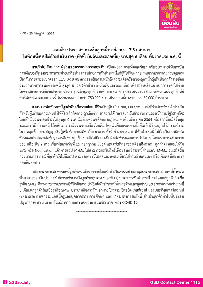 ธนาคารออมสิน...ช่วยลูกค้าสินเชื่อรายย่อยที่ได้รับผลกระทบจากการแพร่ระบาดของ COVID-19 มาตรการ "พักชำระหนี้" ทั้งเงินต้นและดอกเบี้ย