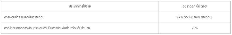 - กรณีผิดนัดชำระจะถูกเรียกเก็บดอกเบี้ยผิดนัดชำระเท่ากับอัตราดอกเบี้ยปกติสูงสุดตามสัญญา + ส่วนเพิ่ม 3% ต่อปีของเงินต้นบนค่างวดที่ผิดนัดชำระ ทั้งนี้ สูงสุดไม่เกิน 25% ต่อปี