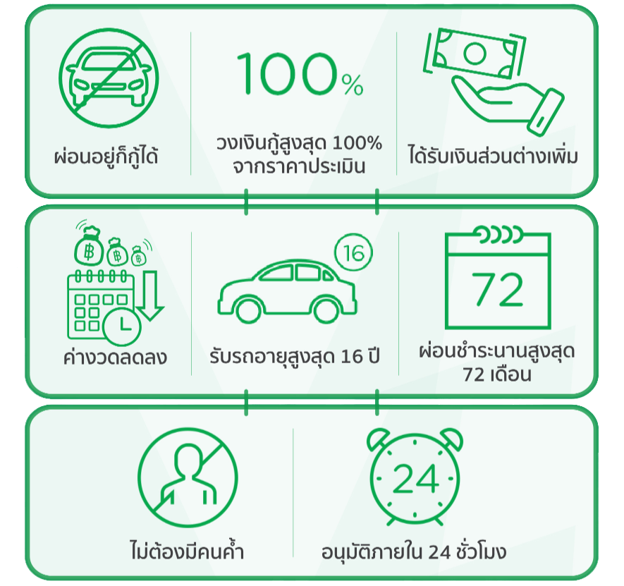 - ลูกค้ามีชื่อระบุในสมุดคู่มือจดทะเบียนรถเป็นผู้ครอบครองรถยนต์อย่างน้อย 6 เดือน และมีภาระผูกพันกับไฟแนนซ์/สถาบันการเงินเดิมตามที่บริษัทกำหนด