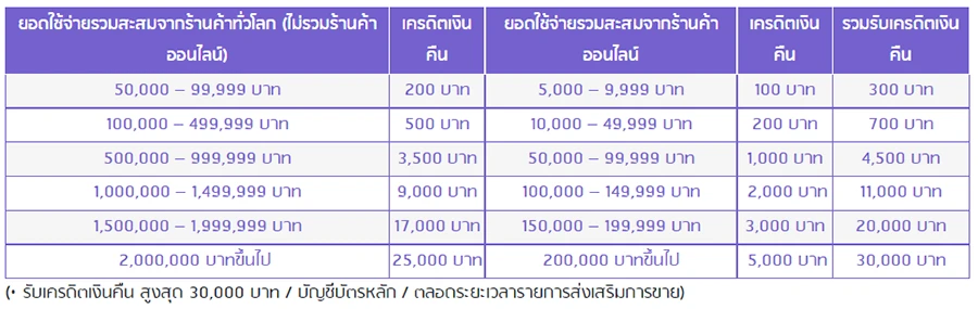 - ผู้ถือบัตรจะได้รับเครดิตเงินคืน เมื่อมียอดใช้จ่ายสะสม ณ ร้านค้าทั่วโลก และ/หรือร้านค้าออนไลน์ทั่วโลก ผ่านบัตรเครดิตที่ร่วมรายการ (จำกัดเครดิตเงินคืนสูงสุด 30,000 บาท/บัญชีหลัก/ตลอดระยะเวลารายการส่งเสริมการขาย และยอดใช้จ่ายจากบัตรเสริมจะคำนวณรวมเข้าบัตรหลัก) ดังนี้