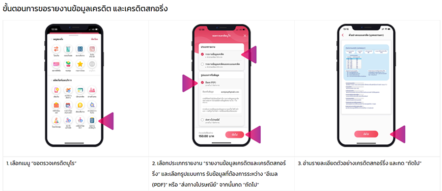 - ธนาคารกรุงไทย Krungthai NEXT : ตรวจข้อมูลเครดิต และเครดิตสกอริ่งรับรายงาน (NCB e-Credit Report) ทางอีเมล ภายใน 24 ชม. (*เงื่อนไขเป็นไปตามที่เครดิตบูโรกำหนด)
