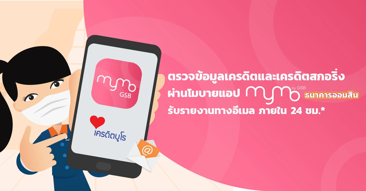 แอปพลิเคชัน - ธนาคารออมสิน MyMo : รับรายงานข้อมูลเครดิต และเครดิตสกอริ่ง ทางอีเมลภายใน 24 ชั่วโมง* (*ทั้งนี้ต้องเป็นไปตามเงื่อนไขที่เครดิตบูโรกำหนด)