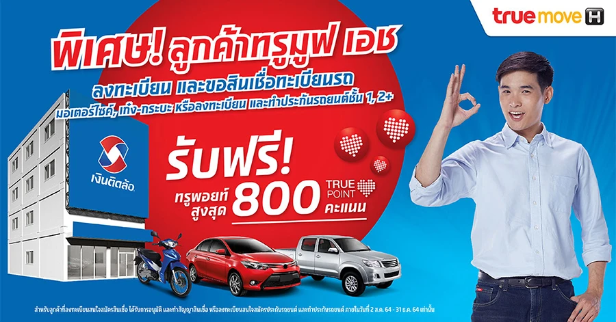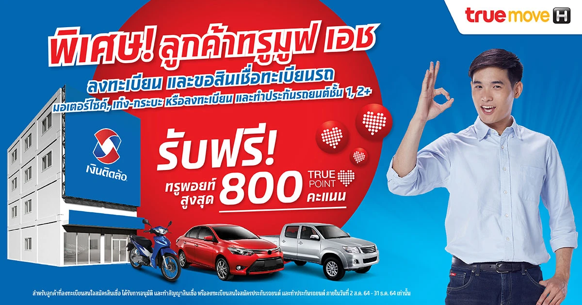 พิเศษ! ลูกค้าทรูมูฟ เอช ลงทะเบียนและขอสินเชื่อทะเบียนรถ รับฟรี...ทรูพ้อยท์สูงสุด 800 คะแนน