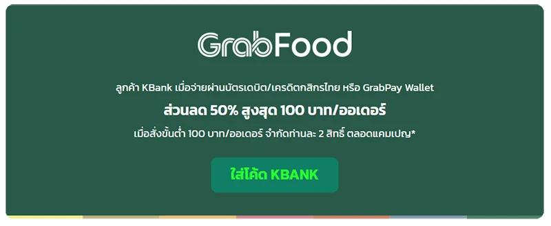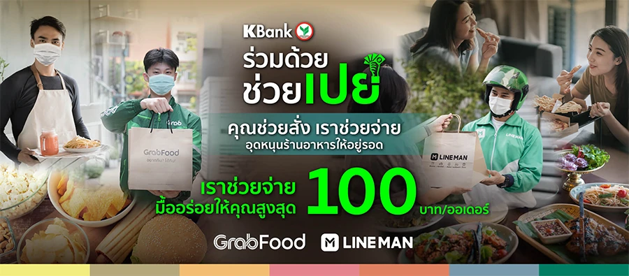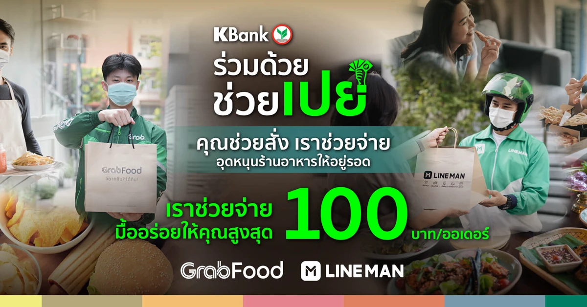 KBank ร่วมด้วย ช่วยเปย์ มื้ออร่อยให้สูงสุด 100 บาท/ออเดอร์ เมื่อสั่งอาหารผ่าน GrabFood หรือ LINEMAN