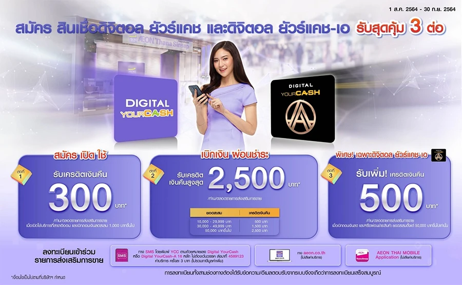 • บริษัทฯ สงวนสิทธิ์ในรายการส่งเสริมการขายนี้เฉพาะสมาชิกบัตรที่ลงทะเบียนร่วมรายการส่งเสริมการขายทาง SMS โดยพิมพ์ YCC ตามด้วยเลขที่ สินเชื่อดิจิตอลยัวร์แคชหรือสินเชื่อดิจิตอลยัวร์แคช เอ 16 หลัก ที่ได้รับการอนุมัติจากบริษัทฯ ไม่ต้องเว้นวรรค ส่งมาที่ 4589123 ผ่าน เครือข่ายโทรศัพท์ AIS dtac หรือ truemove H ภายในระยะเวลารายการส่งเสริมการขาย โดยจะต้องได้รับข้อความตอบรับจากระบบจึงจะถือว่าการลงทะเบียนเสร็จสมบูรณ์ อัตราค่าส่ง SMS ครั้งละ 3 บาท/ครั้ง (ไม่รวมภาษีมูลค่าเพิ่ม) หรือ ลงทะเบียนผ่าน AEON THAI MOBILE Application  หรือ  www.aeon.co.th (ไม่เสียค่าบริการ) ทั้งนี้โปรดเก็บหลักฐานการลงทะเบียนไว้ในกรณีที่บริษัทฯ ร้องขอเพื่อตรวจสอบ