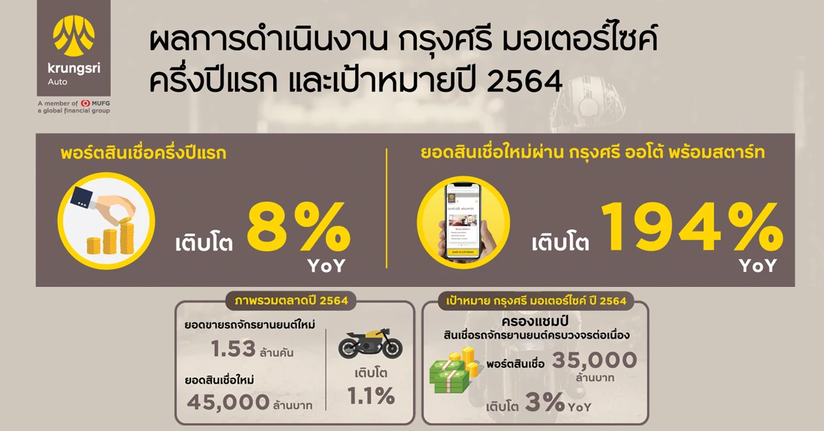 "กรุงศรี ออโต้" ผู้นำธุรกิจสินเชื่อยานยนต์ครบวงจร เครือธนาคารกรุงศรีอยุธยา จำกัด (มหาชน) เผยพอร์ตสินเชื่อรถจักรยานยนต์ "กรุงศรี มอเตอร์ไซค์" ครึ่งปีแรกเติบโต 8% จากช่วงเดียวกันของปีก่อนหน้า พร้อมยกระดับนวัตกรรมดิจิทัลเพื่อส่งเสริมการขายของพันธมิตร ชูผลิตภัณฑ์หลากหลายตอบโจทย์ครบทุกความต้องการ และเปิดตัวฟีเจอร์เด่นรุกเซ็กเมนต์รีไฟแนนซ์ เชื่อมั่นยอดสินเชื่อคงค้างรวมปีนี้ทะลุ 35,000 ล้านบาท เติบโต 3% ครองแชมป์สินเชื่อรถจักรยานยนต์ครบวงจรต่อเนื่อง