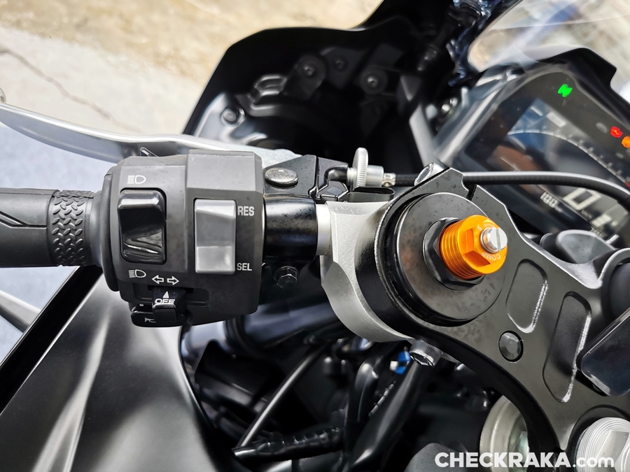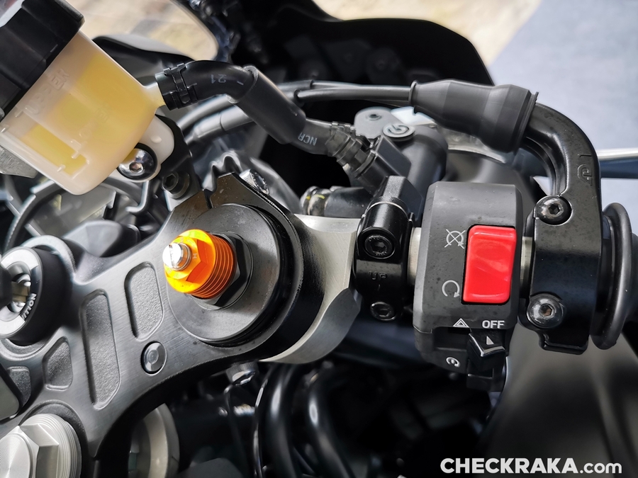 หลักจากขี่ครบ 5 กลุ่ม ก็เป็นช่วงพักรับประทานอาหารกลางวัน ผู้เขียนคาดหวังว่าช่วงบ่ายฝนจะหยุดและมีแดดมาสลับให้ขี่แบบแห้งบ้าง แต่สุดท้ายฝนก็ไม่หยุดกลับลงหนักสลับเบา ทำให้การขี่ทดสอบช่วงบ่ายต้องดีเลย์อีกครั้ง หลังทีมงานได้ลงไปขี่ตรวจสภาพสนามจนมั่นใจว่าพร้อมทดสอบได้อย่างปลอดภัย กลุ่มแรกก็ทยอยนำรถลงสู่สนาม ทดสอบวนจนมาถึงกลุ่ม 2 ได้ยินว่าระหว่างการทดสอบผู้ขี่บางคนประสบปัญหาเรื่องฝ้าขึ้นชิลด์ทำให้ขี่ได้ไม่เต็มที่ ผู้เขียนที่ใช้หมวกสกอร์เปี้ยน (ซื้อใช้เองไม่มีค่าโฆษณา) ตอนแรกก็กังวลเพราะไม่ได้ใส่พินล็อคแต่ปรากฎว่าไม่มีฝ้ามารบกวนชิลด์หน้าเลย ส่วนตัวเปิดแค่ช่องระบายลมตรงปากไว้เท่านั้น นอกจากนี้ชิลด์ที่ใช้เป็นแบบดำสนิท ก็ยังให้ทัศนวิสัยการมองเห็นชัดเจนเป็นหมวกที่ใช้ขี่ในแทร็คได้ดีจริงๆ (แต่ใส่ขี่อออกทริปนานๆ ไม่ค่อยสบายนัก) เซสชั่นที่ 2 ผู้เขียนที่เริ่มคุ้นกับตัวรถมากขึ้นสามารถขี่ได้ดั่งใจมากขึ้น แต่ก็ยังเผื่อทั้งจุดเบรกและความเร็วในโค้งไว้เพื่อความปลอดภัย ความเร็วสูงสุดเท่าที่ทำได้ก่อนเข้าโค้ง 3 อยู่ที่ 200 กม./ชม. กับเกียร์ 5 ซึ่งน่าจะไปได้อีกหน่อยถ้าไม่เผื่อจุดเบรกเร็วขึ้น การเร่งออกจากโค้งในเซสชั่นนี้ก็ยังไม่เจออาการสลิปแต่อย่างใด ทำให้มั่นใจว่า R7 จะเป็นซูเปอร์สปอร์ตบิ๊กไบค์รุ่นเริ่มต้นที่ได้รับการตอบรับดีมากๆ รุ่นหนึ่ง ด้วยสเปคที่มีให้นับว่าพอดีกับสมรรถนะที่ขี่สนุก ราคาเข้าถึงง่าย และที่สำคัญตัวรถได้คุณภาพการผลิตและนำเข้าจากประเทศญี่ปุ่น ซึ่งผู้เขียนก็อยากมีไว้ขี่เองสักคัน จากนี้คงรอพิสูจน์การขี่บนถนนจริงกับการออกทริปทางไกลรวมทั้งการใช้งานในเมืองว่า R7 จะเป็นซูเปอร์สปอร์ตบิ๊กไบค์ที่เฟรนด์ลี่ย์กับการขี่บนถนนมากระดับไหน