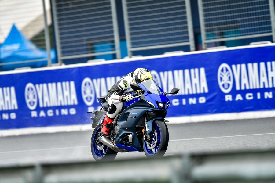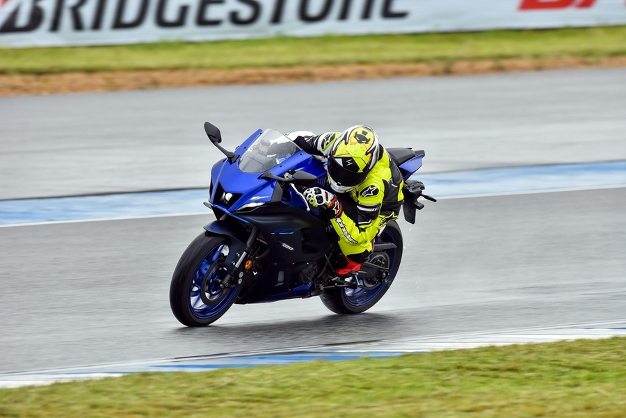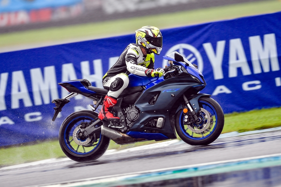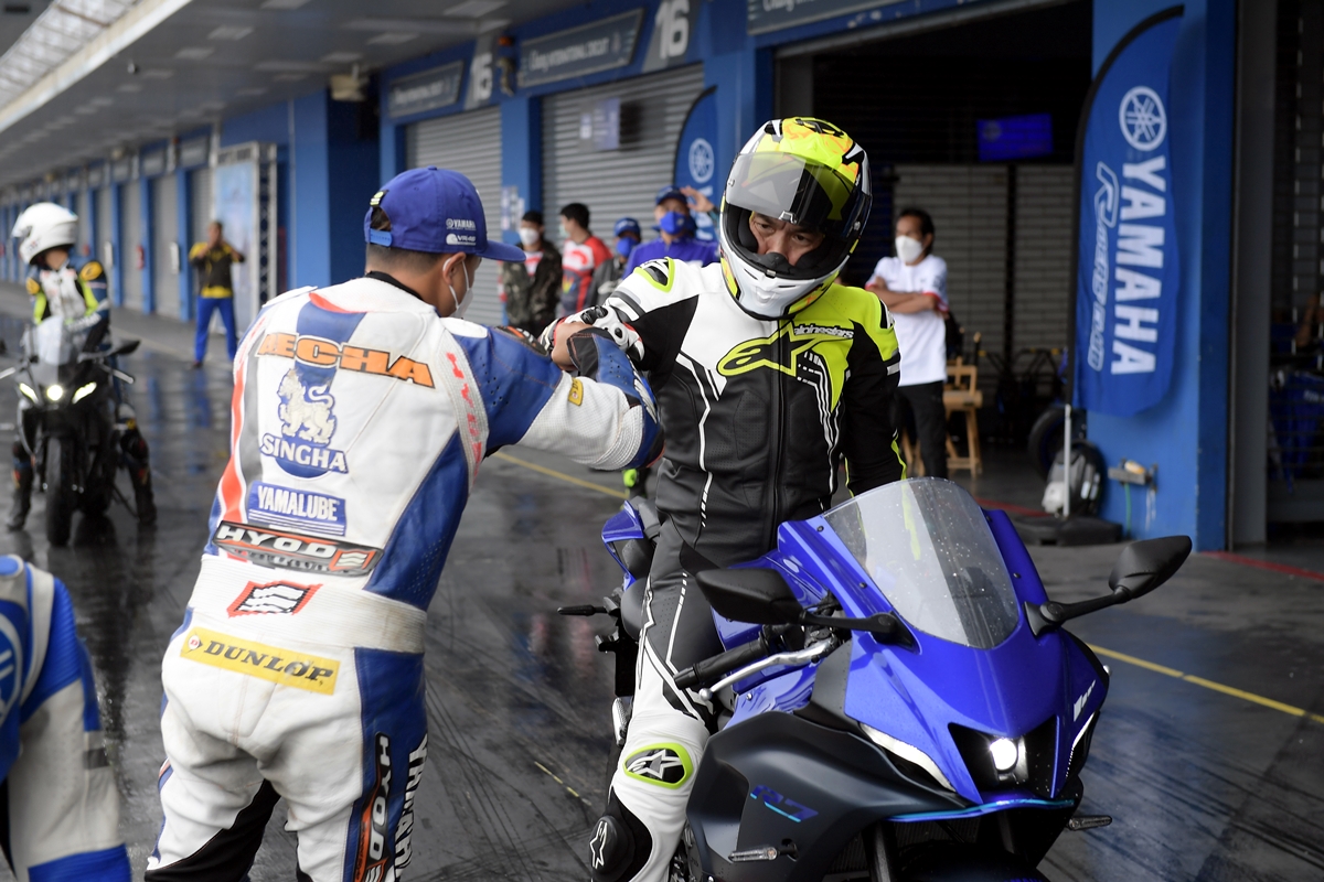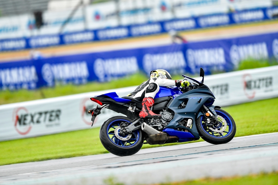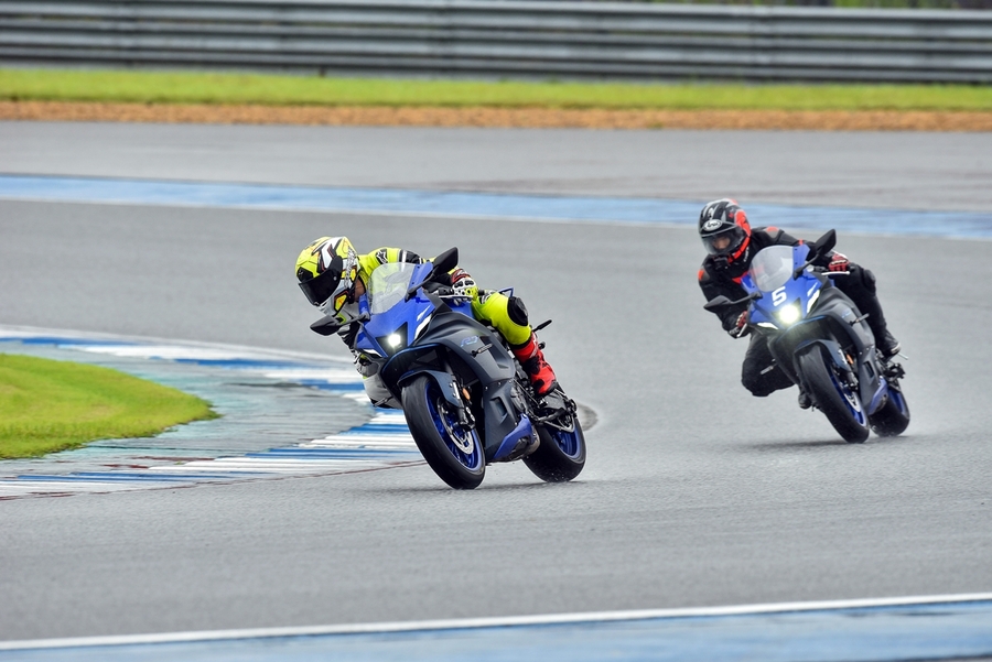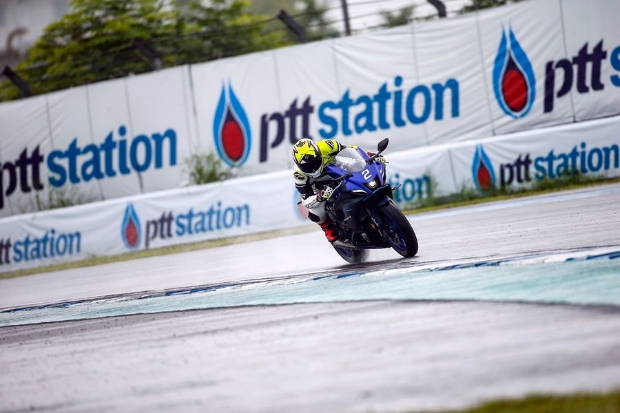 มิชชั่นการทดสอบขี่ ยามาฮ่า YZF-R7 ออนแทร็ค ถูกกำหนดขี่แบบวันเดียวแบ่งเป็น 5 กลุ่ม แต่ละกลุ่มมี 7 คัน (สื่อ) ได้รันกลุ่มละ 2 เซสชั่น ผู้เขียนอยู่ในกลุ่ม 2 แต่จากความตั้งใจทดสอบรถสแตนดาร์ดบนแทร็กแห้งกลายเป็นต้องรันบนแทร็คเปียกเพราะมีฝนตกลงมาก่อนหน้าและตลอดวันทดสอบ อย่างไรก็ตามทางเจ้าหน้าที่สนามและนักแข่งทีมยามาฮ่าได้ร่วมตรวจสอบสภาพสนามอยู่ตลอดเวลาเพื่อความปลอดภัยจริงๆ ของผู้ร่วมทดสอบทำให้ดีเลย์ไปบ้าง แต่สุดท้ายกลุ่มแรกก็ได้ไฟเขียวให้ออก การขี่ของแต่ละกลุ่มได้เวลา 15 นาที ต่อเซสชั่น ช่วงแรกทางทีมผู้จัดได้ให้ผู้ฝึกสอนมานำไลน์เสมือนวอร์มอัพแล็บ 2 รอบ แล้วจึงปล่อยให้วิ่งได้แบบอิสระ จนถึงคิวกลุ่ม 2 ของผู้เขียนที่ค่อนข้างกังวลกับสภาพสนามที่ยังเจิ่งนองด้วยน้ำ และฝนก็ยังพรำไม่หยุด ข้อควรระวังสำคัญในการขี่รถบนแทร็คของสนามช้างอินเตอร์เนชั่นแนลแบบนี้ก็คือ อย่าให้หลุดไปจนถึงขอบเคิร์บเพราะสีที่ทาไว้จะทำให้ยางสลิปได้ง่ายมาก และรถรุ่นนี้ไม่มีระบบแทร็คชันคอนโทรลทำให้ต้องเน้นเรื่องการเปิดคันเร่งออกจากโค้งให้มากขึ้นด้วย ผู้เขียนเพิ่งขี่ยามาฮ่า R7 เป็นครั้งแรกก็เจอความท้าทายเลย เรียกว่าไปทำความรู้จักกันในสนาม ช่วงแรกก็มีผู้ฝึกสอนนำไลน์ขี่เหมือนรอบวอร์มอัพ ผู้เขียนพยายามวอร์มหน้ายางตั้งแต่ขี่ออกจากพิท รวมไปทั้งวอร์มผ้าเบรกหน้าให้ถึงอุณหภูมิที่พร้อมทำงาน ช่วง 2 รอบแรกรู้สึกได้ถึงท่านั่ง โพซิชั่น ไรด์ดิ้ง ยังให้ความเป็นซูเปอร์สปอร์ตคล้ายกับรุ่นพี่ R6 ด้วยข้อมูลที่ได้จากทีมงานบริฟก่อนลงทดสอบ คือ ตำแหน่งแฮนด์ของ R7 นั้นอยู่สูงกว่า R6 นิดเดียว และไม่สูงเหมือน R3 ที่เป็นสปอร์ตทัวร์ริ่งมากกว่า นั่นทำให้เข้าใจได้ชัดเจนว่า R7 ถูกวางตำแหน่งการใช้งานไว้ทั้งบนถนนและแทร็คแบบสมดุล เริ่มจากทดสอบขี่ไปได้ลองจับอาการตอนเข้าโค้ง เร่ง และชะลอเบาเบรกตลอดจนการลดเกียร์แบบทีละจังหวะ ทั้งหมดให้การตอบสนองที่ดีและเกิดความคุ้นชินได้ไว รู้สึกได้ว่า R7 เป็นรถที่ขี่ในแทร็คง่ายตั้งแต่แรก ยิ่งใช้ยางมัลติคอมปาวด์รุ่นท็อป และสลิปเปอร์คลัตช์ทำให้การขี่ก่อนและขณะเข้าโค้งทำได้มั่นใจมากขึ้นตามรอบที่ขี่ ผู้เขียนใช้เวลาขี่ในเซสชั่นแรกเพื่อทำความเข้าใจการใช้เกียร์ คันเร่ง ในโค้งต่างๆ และจับอาการที่ต้องระวัง พอสรุปช่วงแรกได้ว่าด้วยกำลังของ R7 ระดับ 73 แรงม้าที่รอบ 8,750 รอบต่อนาที ให้อัตราเร่งที่ดีควบคุมง่าย เหมาะสำหรับการขี่แทร็คเดย์เพื่อประสบการณ์และความสนุก การไม่มีแทร็คชันไม่ใช่ประเด็นที่ต้องกังวลสำหรับพลั