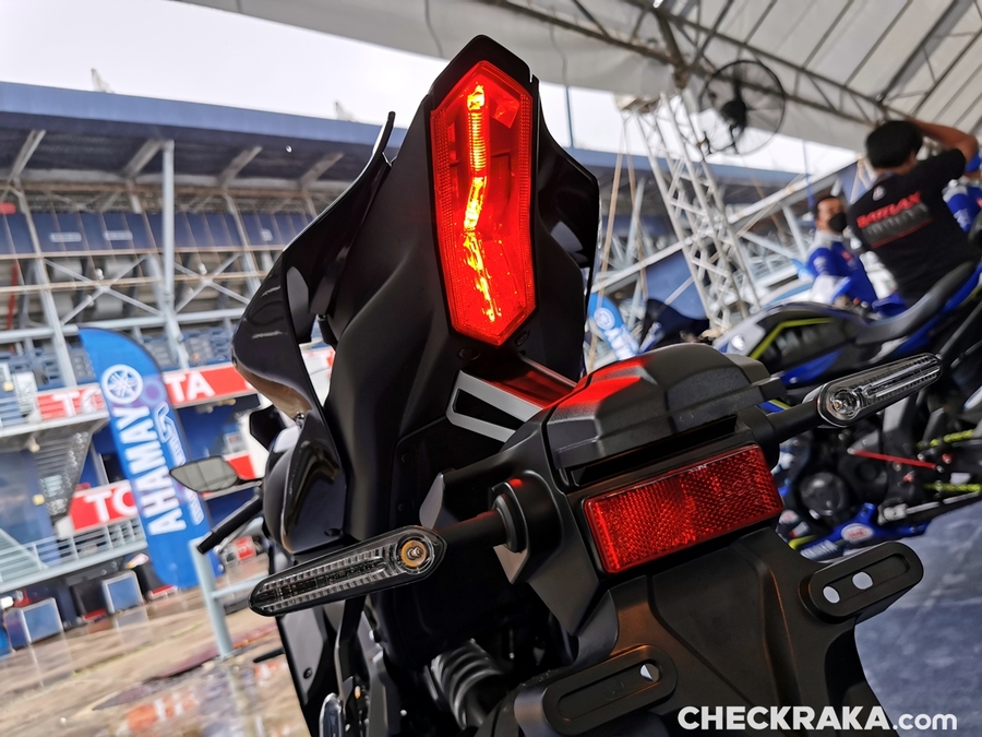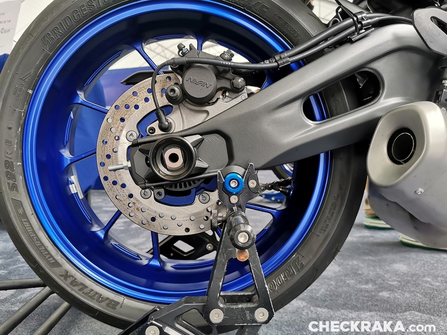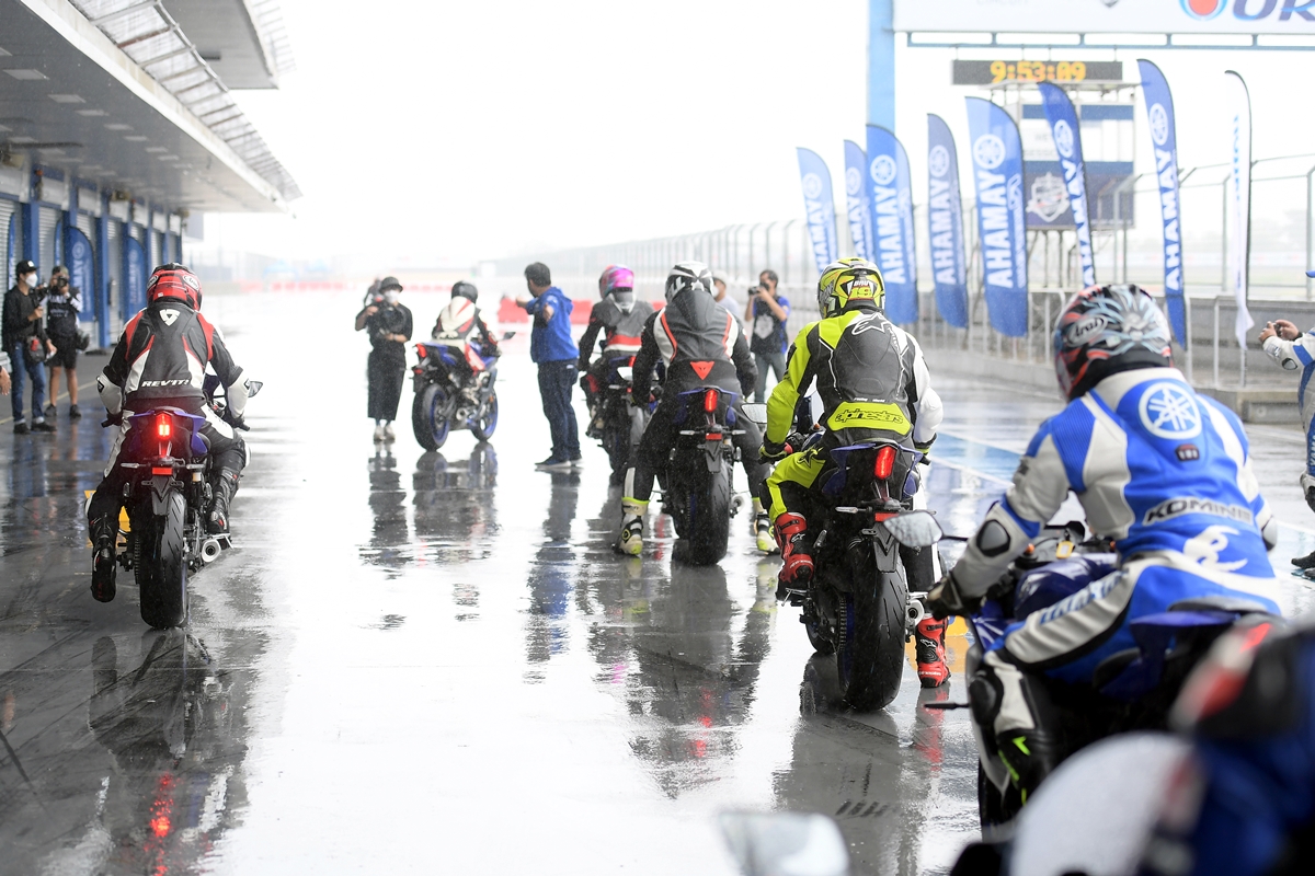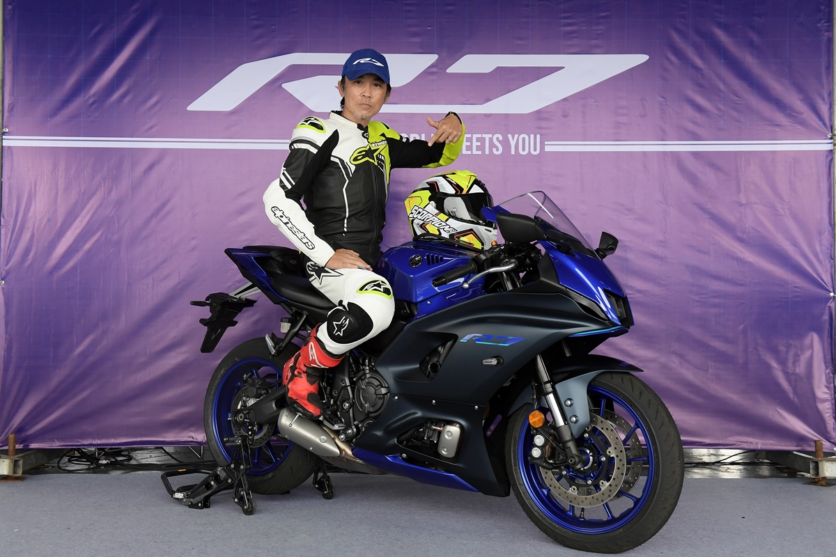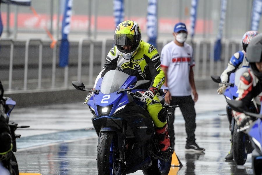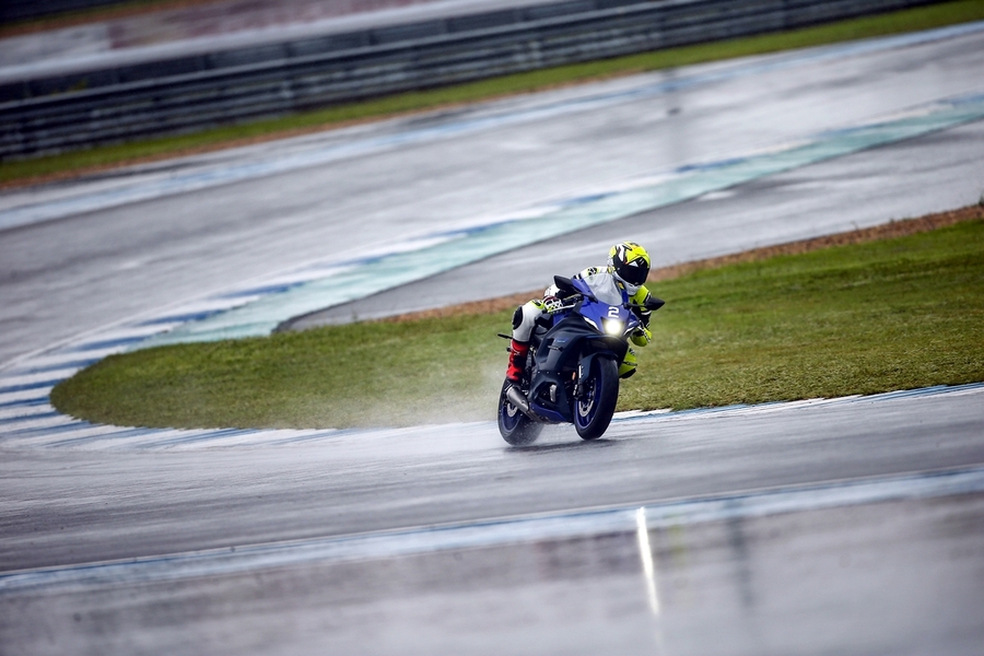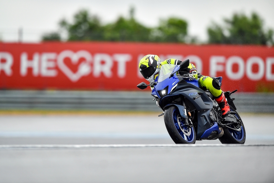 มิชชั่นการทดสอบขี่ ยามาฮ่า YZF-R7 ออนแทร็ค ถูกกำหนดขี่แบบวันเดียวแบ่งเป็น 5 กลุ่ม แต่ละกลุ่มมี 7 คัน (สื่อ) ได้รันกลุ่มละ 2 เซสชั่น ผู้เขียนอยู่ในกลุ่ม 2 แต่จากความตั้งใจทดสอบรถสแตนดาร์ดบนแทร็กแห้งกลายเป็นต้องรันบนแทร็คเปียกเพราะมีฝนตกลงมาก่อนหน้าและตลอดวันทดสอบ อย่างไรก็ตามทางเจ้าหน้าที่สนามและนักแข่งทีมยามาฮ่าได้ร่วมตรวจสอบสภาพสนามอยู่ตลอดเวลาเพื่อความปลอดภัยจริงๆ ของผู้ร่วมทดสอบทำให้ดีเลย์ไปบ้าง แต่สุดท้ายกลุ่มแรกก็ได้ไฟเขียวให้ออก การขี่ของแต่ละกลุ่มได้เวลา 15 นาที ต่อเซสชั่น ช่วงแรกทางทีมผู้จัดได้ให้ผู้ฝึกสอนมานำไลน์เสมือนวอร์มอัพแล็บ 2 รอบ แล้วจึงปล่อยให้วิ่งได้แบบอิสระ จนถึงคิวกลุ่ม 2 ของผู้เขียนที่ค่อนข้างกังวลกับสภาพสนามที่ยังเจิ่งนองด้วยน้ำ และฝนก็ยังพรำไม่หยุด ข้อควรระวังสำคัญในการขี่รถบนแทร็คของสนามช้างอินเตอร์เนชั่นแนลแบบนี้ก็คือ อย่าให้หลุดไปจนถึงขอบเคิร์บเพราะสีที่ทาไว้จะทำให้ยางสลิปได้ง่ายมาก และรถรุ่นนี้ไม่มีระบบแทร็คชันคอนโทรลทำให้ต้องเน้นเรื่องการเปิดคันเร่งออกจากโค้งให้มากขึ้นด้วย ผู้เขียนเพิ่งขี่ยามาฮ่า R7 เป็นครั้งแรกก็เจอความท้าทายเลย เรียกว่าไปทำความรู้จักกันในสนาม ช่วงแรกก็มีผู้ฝึกสอนนำไลน์ขี่เหมือนรอบวอร์มอัพ ผู้เขียนพยายามวอร์มหน้ายางตั้งแต่ขี่ออกจากพิท รวมไปทั้งวอร์มผ้าเบรกหน้าให้ถึงอุณหภูมิที่พร้อมทำงาน ช่วง 2 รอบแรกรู้สึกได้ถึงท่านั่ง โพซิชั่น ไรด์ดิ้ง ยังให้ความเป็นซูเปอร์สปอร์ตคล้ายกับรุ่นพี่ R6 ด้วยข้อมูลที่ได้จากทีมงานบริฟก่อนลงทดสอบ คือ ตำแหน่งแฮนด์ของ R7 นั้นอยู่สูงกว่า R6 นิดเดียว และไม่สูงเหมือน R3 ที่เป็นสปอร์ตทัวร์ริ่งมากกว่า นั่นทำให้เข้าใจได้ชัดเจนว่า R7 ถูกวางตำแหน่งการใช้งานไว้ทั้งบนถนนและแทร็คแบบสมดุล เริ่มจากทดสอบขี่ไปได้ลองจับอาการตอนเข้าโค้ง เร่ง และชะลอเบาเบรกตลอดจนการลดเกียร์แบบทีละจังหวะ ทั้งหมดให้การตอบสนองที่ดีและเกิดความคุ้นชินได้ไว รู้สึกได้ว่า R7 เป็นรถที่ขี่ในแทร็คง่ายตั้งแต่แรก ยิ่งใช้ยางมัลติคอมปาวด์รุ่นท็อป และสลิปเปอร์คลัตช์ทำให้การขี่ก่อนและขณะเข้าโค้งทำได้มั่นใจมากขึ้นตามรอบที่ขี่ ผู้เขียนใช้เวลาขี่ในเซสชั่นแรกเพื่อทำความเข้าใจการใช้เกียร์ คันเร่ง ในโค้งต่างๆ และจับอาการที่ต้องระวัง พอสรุปช่วงแรกได้ว่าด้วยกำลังของ R7 ระดับ 73 แรงม้าที่รอบ 8,750 รอบต่อนาที ให้อัตราเร่งที่ดีควบคุมง่าย เหมาะสำหรับการขี่แทร็คเดย์เพื่อประสบการณ์และความสนุก การไม่มีแทร็คชันไม่ใช่ประเด็นที่ต้องกังวลสำหรับพลั