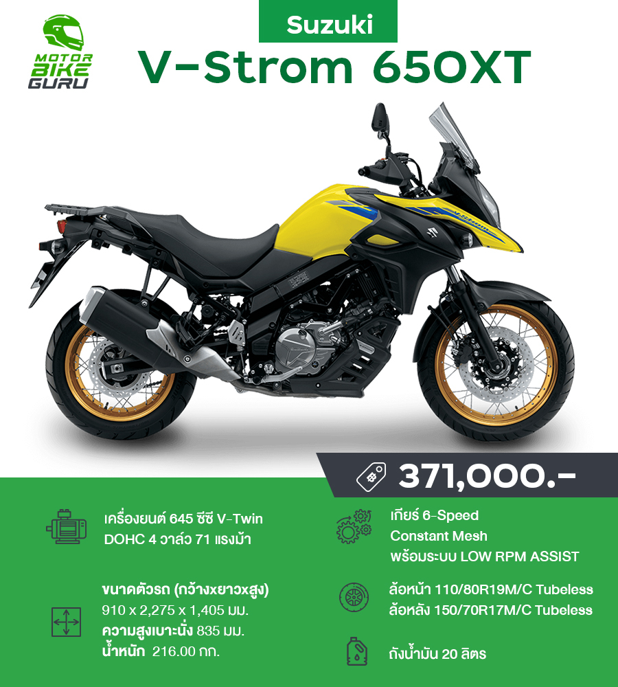 อีกรุ่นที่ฮิตติดอันดับต้นๆ ของไทยอีกเช่นกันกับค่ายรถคนบ้าขี่ซู Suzuki V-Strom 650XT รถจักรยายนต์สไตล์ทั่วริ่งแอดเวนเจอร์ขนาดกลาง มาพร้อมกับเครื่องยนต์แบบ DOCH V-twin ขนาด 645 ซีซี 4 จังหวะ ผสานการทำงานของระบบ Low RPM Assist อัดแน่นไปด้วยเทคโนโลยีที่ช่วยเพิ่มความสนุก ตอบโจทย์ไลฟ์สไตล์การเดินทางในทุกสภาพท้องถนน มีพละกำลังอยู่ที่ 62.2 แรงม้า (ที่ 8,800 รอบ/นาที) แรงบิดสูงสุดที่ 62 นิวตันเมตร (ที่ 6,500 รอบ/นาที)