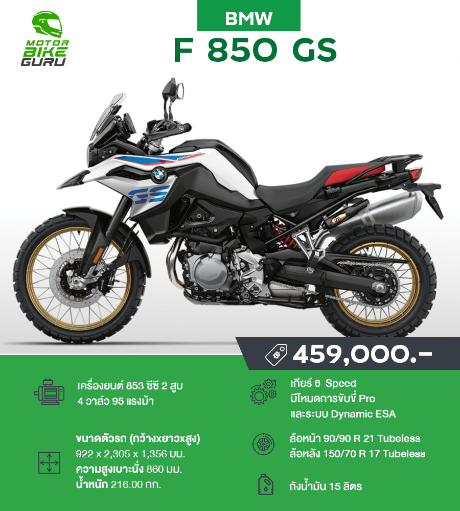 BMW F 850 GS ใหม่ มาพร้อมเครื่องยนต์ 2 สูบ, 4 วาล์ว/สูบ ความจุ 853 ซีซี 95 แรงม้า ที่ 8,250 รอบ/นาที แรงบิด 92 นิวตัน ที่ 6,250 รอบ/นาที ด้วยตัวถังน้ำหนักเบาและระบบช่วงล่างที่ถูกออกแบบมาเป็นพิเศษเพื่อรองรับการขับขี่แบบ Enduro ผนวกกับคุณสมบัติด้านเสถียรภาพและความสะดวกสบายในการขับขี่ทางไกล กระจกกันลมขนาดใหญ่ขึ้น สามารถปรับได้ 2 ระดับ รวมถึงการ์ดแฮนด์ เพิ่มการป้องกันจากสภาพลมและฝนให้แก่ผู้ขับขี่ ไฟหน้า LED ที่วางเท้าแบบเอนดูโร่ คันคลัทช์และเบรกปรับได้ โครงป้องกันเครื่องยนต์ และที่วางสัมภาระด้านท้ายในวัสดุสแตนเลสสตีลยังได้รับการติดตั้งระบบเสริมความปลอดภัยต่างๆ เช่น ระบบเบรก ABS ที่สามารถเลือกเปิด-ปิดระบบได้ และระบบรักษาเสถียรภาพ ASC Automatic Stability Control เพื่อให้ผู้ขับขี่มั่นใจได้ในทุกสถานการณ์ และเพิ่มโช้คหัวกลับสีทอง ชิลหน้าใหญ่ขึ้น หากใครสนใจหรือหาตัวแทนจำหน่ายก็สามารถเข้ามาชมได้ที่นี่ www.bmw-motorrad.co.th