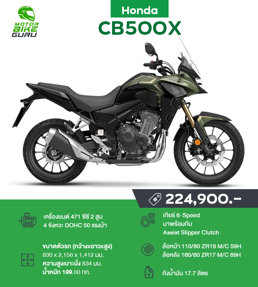 เป็นอีก 1 รุ่นยอดนิยมสำหรับคนที่เริ่มต้นอยากมีบิ๊กไบค์ Adventure ไว้ขี่แบบไม่เน้นสมบุกสมบัน Honda CB500X MY22 รุ่นปรับปรุงล่าสุด ด้วยพละกำลังพอเหมาะพอมือ และน้ำหนักรถที่ไม่หนักเกินไป 199 กก. รวมไปถึงราคาที่เจ้าตลาดยังคงตรึงไว้เท่าเดิมคือ 224,900 บาท ทำให้เป็น 1 ในตัวเลือกที่หลายคนจับตามมองเป็นอันดับต้นๆ