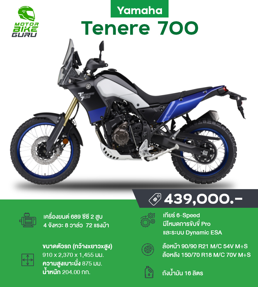 Yamaha Tenere 700 คือแอดเวนเจอร์บิ๊กไบค์ขนาดกลางที่พัฒนาใหม่ มีสไตล์ที่แตกต่างจากทั่วไป เพราะได้แรงบันดาลใจการออกไปเหมือนตัวแข่งแรลลี่จากรายการดาการ์ที่โด่งดัง ดูดุดันด้วยไฟ LED 4 ดวง ตัวรถมีความปราดเปรียวเพรียวลม ถังน้ำมัน 16 ลิตรก็ออกแบบเชฟให้เข่าหนีบง่าย เบาะก็ออกแบบให้โค้งแบนราบตามแนวโครงรถง่ายต่อการโยกย้ายถ่ายน้ำหนักผู้ขี่เครื่องยนต์ 2 สูบเรียง 689 ซีซี ที่ใช้ใน Yamaha MT-07 คันนี้ มาพร้อมพละกำลัง 72 แรงม้า แรงบิดสูงสุด 68 นิวตันเมตร บนน้ำหนักตัว 204 กก ก็ถือทำน้ำหนักตัวมาดีถ้าเทียบกับสเปคที่น้อยกว่าในบางค่าย