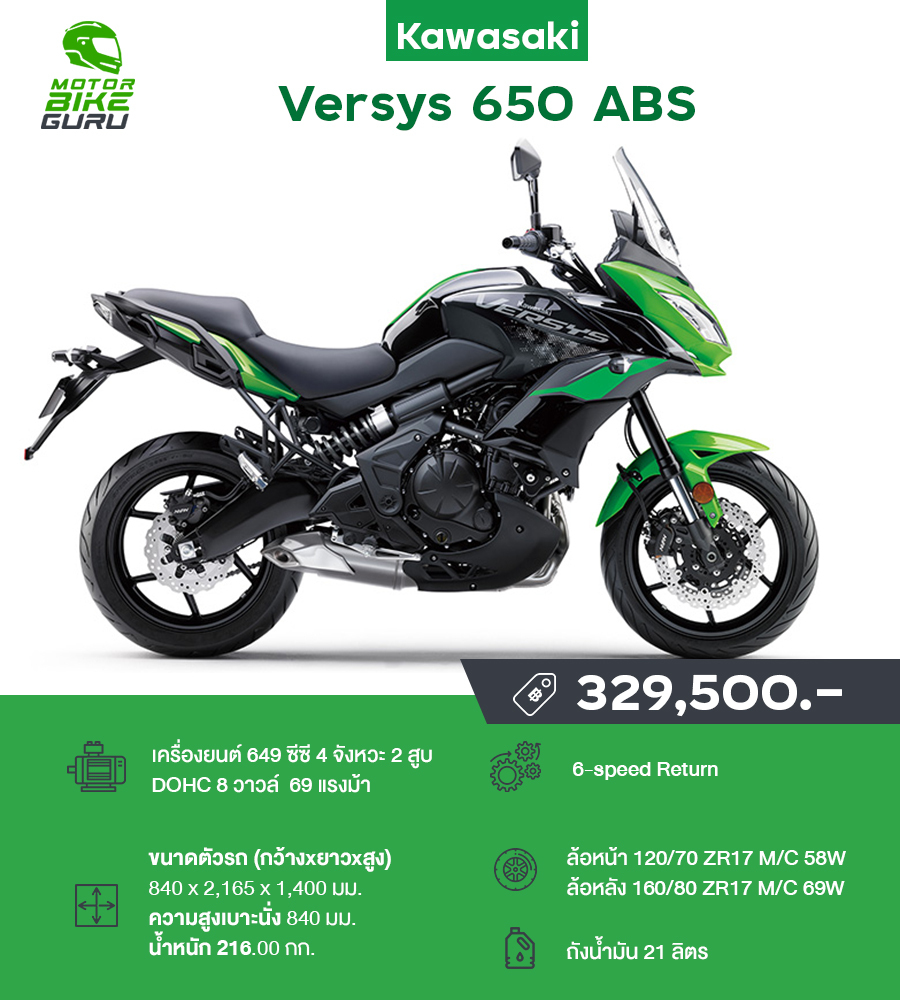 Versys 650 (เวอร์ซิส) เครื่องยนต์ 2 สูบเรียง ขนาด 649 ซีซี 69 แรงม้า มาพร้อมระบบกันสะเทือนสำหรับที่เหมาะกับการขับขี่ระยะไกล (ความพิเศษของมัน) ที่ลุยได้ทุกสภาพถนนแม้กระทั่ง หลุม บ่อ เนิน หรือถนนกรวด โช้คอัพเป็นแบบ Up side down ล้อขนาด 17 นิ้ว แบบรถแข่ง ตัวรถออกแบบรูปทรงให้ดูเพรียวบาง เบาะนั่งถูกปรับให้อยู่ตำแหน่งท่านั่งตรง เหมาะที่จะเป็นรถที่ขับขี่ในชีวิตประจำวัน และท่องเที่ยว อีกทั้งพละกำลังอยู่ในระดับกลาง ซึ่งก็เหมาะกับคนที่พอจะมีทักษะในการขี่บิ๊กไบค์มาบ้างเพราะด้วยการออกแบบ และขนาดที่ดูบึกบึน ทะมัดทะแมง แต่ก็เน้นให้ขี่แบบชิลๆ สบายๆ อีกทั้งราคายังจ่ายง่าย ขายคล่องเริ่มต้นที่ 329,500 บาท ก็เชื่อว่ายังเป็นอีก 1 ตัวเลือกในใจของใครหลายคนเช่นกัน หากใครสนใจหรือหาตัวแทนจำหน่ายก็สามารถเข้ามาชมได้ที่นี่ www.kawasaki.co.th