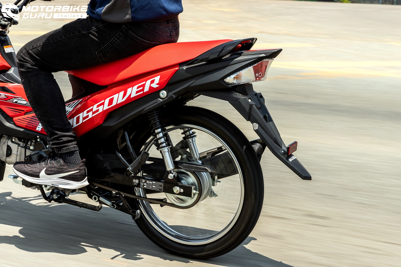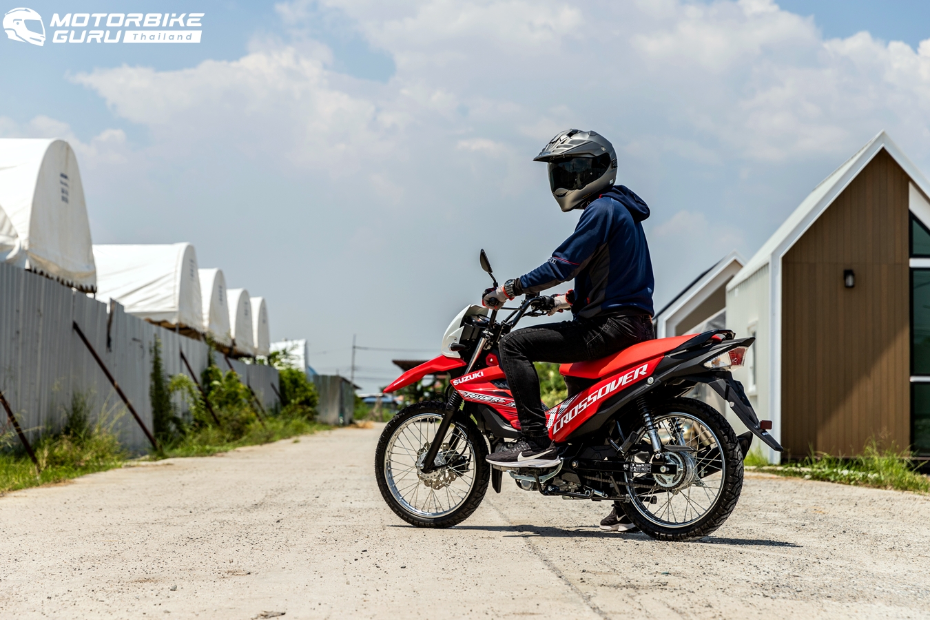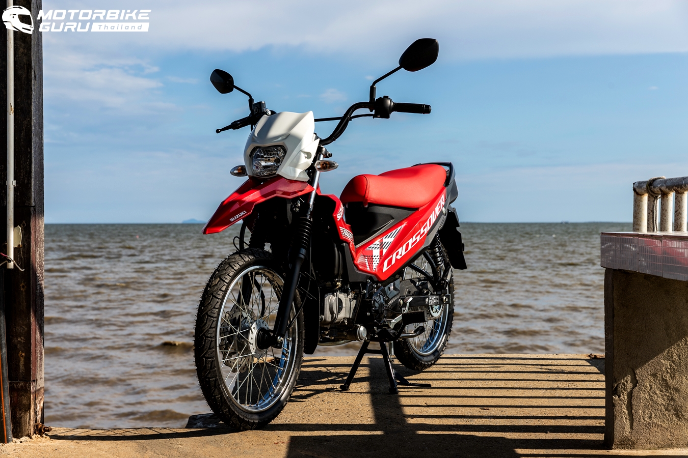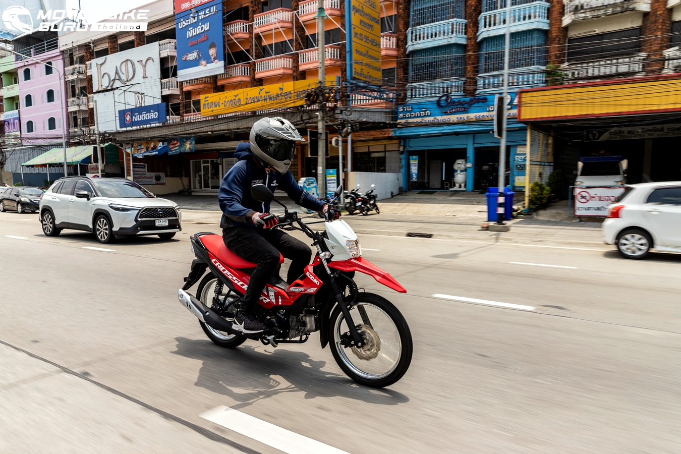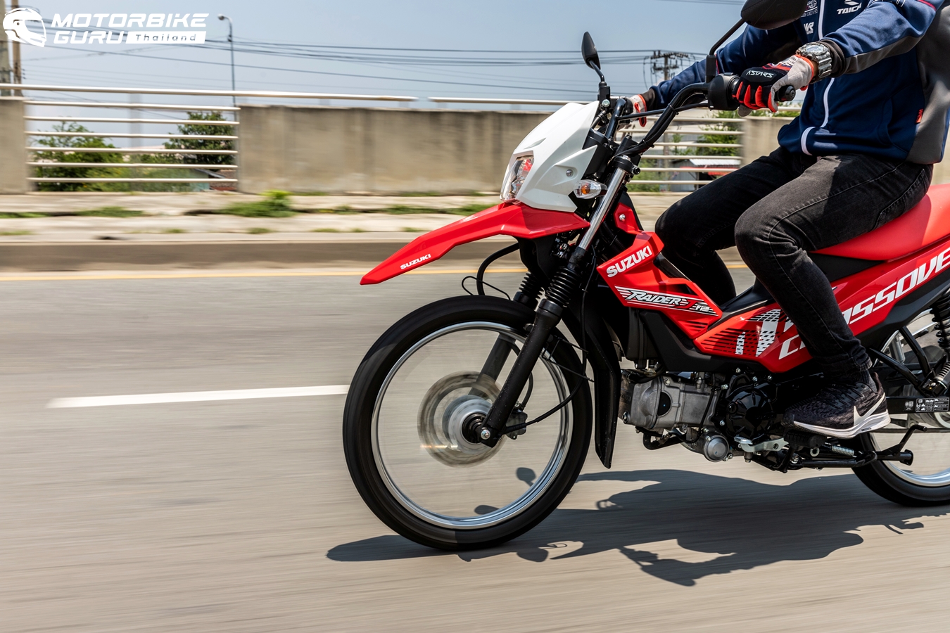 นับเป็นความแปลกที่ได้โอกาสมาทดสอบขี่ Suzuki Raider J Crossover ใหม่ คันที่ได้มาเป็นสีแดง-ขาว ดูอัลสปอร์ตแบบโมโตครอส ก่อนอื่นคาดหวังกับรถรุ่นนี้ไว้แค่รถเล็กเกียร์วน ประหยัดน้ำมัน คล่องตัวใช้เดินทางลุยได้มากกว่าทั่วไปด้วยความสูงใต้ท้องที่มากกว่า ด้านพละกำลังของเครื่องยนต์ขนาด 112.8 ซีซี คงเน้นขี่ถนนทางราบไปได้เรื่อยๆ ลูกรังบ้างก็น่าจะไหวอยู่ ความเร็วสูงสุดเต็มที่คงแตะแถว 100 กม./ชม. เทียบจากรถเล็กคลาสเดียวกัน