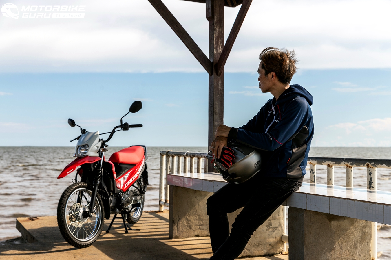 หลังจากพักหลบร้อน ดื่มน้ำ ถ่ายรูปเก๋ๆ กับรถจนพอใจก็ได้เวลาเดินทางต่อสู่ ศาลากลางน้ำตาเจี่ย ซอยวัดราษฎร์บำรุง อันเป็นจุดหมายปลายทางของทริปทดสอบนี้ การขี่ยูเทิร์นหรือเลี้ยวเข้าซอยบนถนนสุขุมวิทสายเก่าที่ถนนค่อนข้างแย่ ประกอบกับรถสิบล้อที่วิ่งกันเร็ว ทำให้ต้องพึ่งสมรรถนะรถที่ไว้ใจได้ แม้จะขี่มาไม่นานแต่ก็ออกตัวจากจุดหยุดนิ่งแล้วต่อเกียร์อย่างรวดเร็ว Suzuki Raider J Crossover ใหม่ ทำได้ดีอย่างน่าพอใจ อีกอย่างคือเกียร์ 4 สปีดของรุ่นนี้ ให้แรงบิดที่ดีพอจากการลองใช้ความเกียร์สูงกับความเร็วต่ำ ทำให้บางจังหวะไม่ต้องชิฟต์เกียร์ลงเพื่อเอารอบ ส่วนยางติดรถแม้ยี่ห้อไม่คุ้นชื่อเพราะผลิตจากประเทศฟิลิปปินส์ติดมากับรถหน้ากว้าง 70 ด้านหน้า หลัง 80 บนวงล้อขนาด 17 นิ้วที่ขึ้นแบบซี่ลวดก็ให้การยึดเกาะที่ดีพอไม่มีลุ้นลื่นไถล ขี่มาถึงปากทางเข้าวัดราษฎร์บำรุง ยังรู้สึกโอเคกับกล้ามเนื้อส่วนต่างๆ ไม่มีอาการเมื่อยล้าแต่อย่างใด ชอบที่แฮนด์บาร์ออกแบบกว้างและยกสูงทำให้ขี่สบายยาวๆ ช่วงเดินเบาความร้อนจากเครื่องยนต์ขนาดเล็กที่เป็นแบบระบายด้วยอากาศไม่ส่งผลกระทบอะไร แต่เหมือนยิ่งร้อนยิ่งวิ่งดี มาถึงสะพานทอดยาวไปศาลากลางน้ำที่แคบแบบรถขี่สวนกันไม่ได้และไม่มีรั้วกั้นใดๆ สายตาผู้ขี่จับจ้องไปยังเบื้องหน้า พยายามไม่หันไปมองทะเลรอบข้าง แม้ปกติคนเราจะขี่ทางแคบตรงยาวแบบนี้ได้ แต่พอมีอุปสรรคน้่ำข้างไร้รั้วกั้นแบบนี้นับว่าบีบหัวใจไม่น้อย ผู้เขียนเดินคันเร่งที่เกียร์ 2 ไปเรื่อยๆ อย่างคงที่ ตัวรถให้สมดุลที่ดี อดเสียวลมข้างพัดเข้ามา ถ้าพัดแรงๆ คงเป็นเรื่องแน่นอน แม้บริเวณศาลาเป็นพื้นที่แคบแต่ก็เพียงพอให้ Raider J Crossover กลับรถและเคลื่อนย้ายจุดจอดได้สะดวก หามุมที่อยากถ่ายรูปได้ตามใจ ผู้เขียนพักจอดดื่มด่ำกับบรรยากาศทะเลสมุทรปราการจนพระอาทิตย์ใกล้ลับฟ้า จึงเริ่มเดินทางต่อและก็ต้องอาศัยความคล่องตัวกับอัตราเร่งลุยฝ่ารถในช่วงเย็นอีกครั้งตัวรถที่คุ้นชินทำให้ใช้ขี่ได้สนุกคล่องแคล่วมาก ทั้งการเปลี่ยนเลน ชะลอเบาเบรก เร่งแซงรถช้า ขณะที่ระดับเข็มน้ำมันแทบไม่เคลื่อนตัวมากนักจากจุดเริ่มต้น ด้วยถังน้ำมันจุขนาด 4 ลิตร การเดินทางทริปสั้นๆ ว่า 150 กม. เทียบเคียงและประมาณน่าจะอยู่ราว 50 กม./ล. บวกลบ เสียดายที่ไม่มีเวลาลองขี่ยาวแบบน้ำมันเต็มถังไล่ไปให้จบ สรุปสมรรถนะโดยรวมจากการขี่ทดสอบครั้งนี่สร้างความประทับใจให้กับผู้เขียนไม่น้อยด้วยราคาค่าตัวรถ รูปลักษณ์เฉพาะตัว กำลังเครื่องยนต์ การทำงานของช่วงล่าง ล้อ ยาง ขาดแค่เรื่องพ