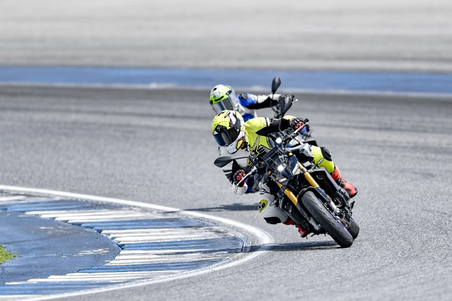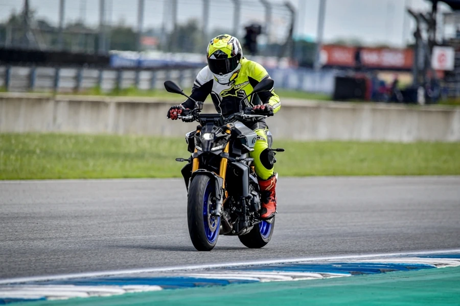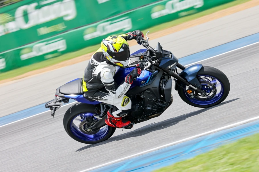 การทดสอบ ยามาฮ่า บิ๊กไบค์ MT-09 แบบเอ็กคลูซีฟ ผู้เขียนได้มีโอกาสลงขี่ 4 เซสชั่น แบ่งเป็นรุ่น SP และ standard อย่างละ 2 รอบ ซึ่งพอสรุปได้ดังนี้ ฟิวแรกคร่อมบนยามาฮ่า MT-09 SP รู้สึกถึงความเบา (น้ำหนักตัวไม่เกิน 190 กก.) และมิติที่กระทัดรัด เหมือนขี่ MT รุ่นเล็ก แต่พอเดินคันเร่งออกจากแพดดอคก็เริ่มสัมผัสได้ถึงแรงบิดที่พร้อมปลดปล่อยออกมาทุกเมื่อ ตลอดจนการทำงานของช่วงล่างที่แน่น นิ่ง เพราะโช้กคู่หน้าเป็นแบรนด์ KYB กระบอกทองแกน แกนใหญ่ขนาด 41 มม. ด้านหลังหลัง Öhlins ปรับพรีโหลด จังหวะยุบ-ยืดได้หมด พร้อมเบรกระดับพรีเมียม Brembo Stylema เมื่อขี่จบทั้ง 2 เซสชั่นกับรุ่นนี้ และอีก 2 กับรุ่นสแตนดาร์ด ขอสรุปในเรื่องกำลังและเกียร์ที่เหมือนกันว่า ใครที่ชอบแรงบิดมาไว ดึงหนักทันใจ แต่คงความสมูธ ช่วยให้การเร่งออกจากโค้งไม่ต้องห่วงเรื่องรอบมาก จริงๆ ในมุมนักขี่สมัครเล่น และทั่วไปนับว่าขี่ง่ายกว่ารถรอบจัด แถมจุ่มได้ลึกก่อนเข้าโค้งอย่างมั่นใจกับเบรกเบรมโบ้ พอคุ้นชินกับตัวรถแล้วก็สามารถขี่ได้อย่างสนุกในทุกรอบจริงๆ อย่างไรก็ตามความต่างในการขี่อยู่ที่ช่วงล่างที่ใช้พาร์ตต่างกัน ซึ่งตอบสนองการทำงานต่างกันตามสเปค และราคา ดังนั้นรุ่น SP ที่ให้เกรดพาร์ตช่วงล่าง KYB และ Öhlins พร้อมเบรกเบรมโบ้ย่อมตอบสนองการขี่ในแทร็คที่ใช้สมรรถนะความเร็วสูง บนพื้นผิวที่ราบเรียบได้สปอร์ตกว่า การขี่ผ่านโค้ง ชะลอเบาเบรก และเร่งออกตัว ฉับไวและไหลลื่น จังหวะตัวรถที่มีอาการหน้าไว ตอนเปิดคันเร่ง พร้อมทั้งจังหวะบั้มเคิร์บ และยุบตัวตอนเบรกนั้นเบากว่า แต่โดยรวมทั้ง 2 รุ่น สามารถขี่ในแทร็คได้สนุกด้วยขุมพลัง 3 สูบขนาด 890 ซีซี พลัง 117 แรงม้า ส่งผ่านเกียร์ 6 สปีด พร้อมถังน้ำมันดีไซน์ใหม่ล้วนส่งผลให้ตัวรถดูสวยสปอร์ตและขี่สนุกยิ่งขึ้น