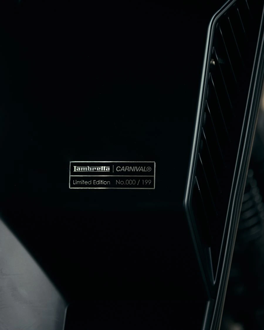 Lambretta X300 Carnival Limited Edition รุ่นพิเศษนี้ ผลิตเพียง 199 คันในโลก! ซึ่งทุกคันจะมีเพลทรัน Serial Number ตั้งแต่ 001-199 นอกจากนี้ยังมาพร้อมกับคอลเลกชันพิเศษ Carnival x Lambretta Exclusive Box Set ประกอบด้วย License Plate Frame, Tube Tax Holder, Mini Glove Box Bag, Scooter Cover, Club Banner และ Carnival x Lambretta Scooter Helmet ที่มีมาให้พิเศษเฉพาะผู้ที่เป็นเจ้าของรถรุ่นนี้เท่านั้น ตอกย้ำความเป็นแรร์ไอเทม ที่เหล่านักสะสมและแฟนๆของทั้งสองแบรนด์ไม่ควรพลาด!