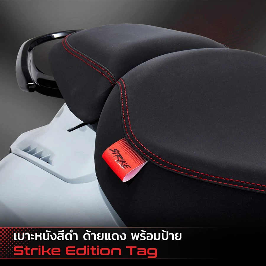 เบาะนั้งดีไซน์ใหม่แบบ 2 ตอน สำหรับผู้ขับขี่และผู้โดยสาร (Rider Seat Passenger Seat) ออกแบบมาให้เว้ารับกับสรีระในขณะขับขี่พร้อม Trim ด้วยด้ายสีแดงและเพิ่ม Tag Label คำว่า Strike Edition ที่เพิ่มความโดดเด่นเข้ามาด้วย ทางด้านท้ายของรถออกแบบใหม่เพิ่มบาร์ท้ายสีดำ (Handle Holder) เพิ่มความดุดัน