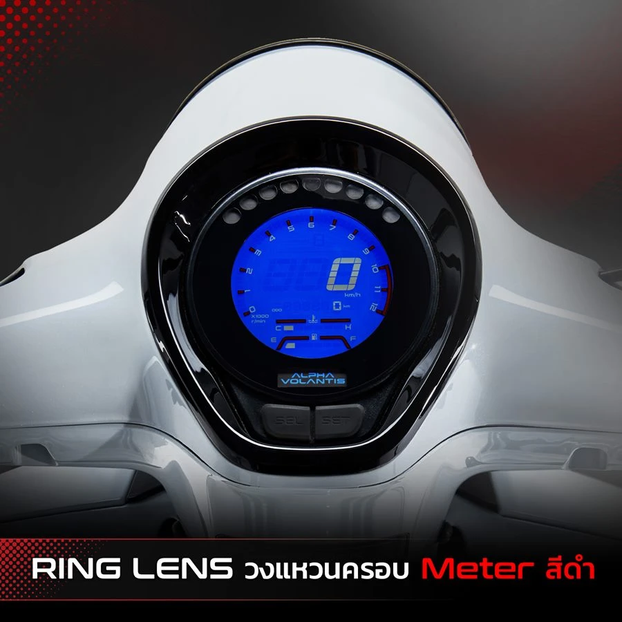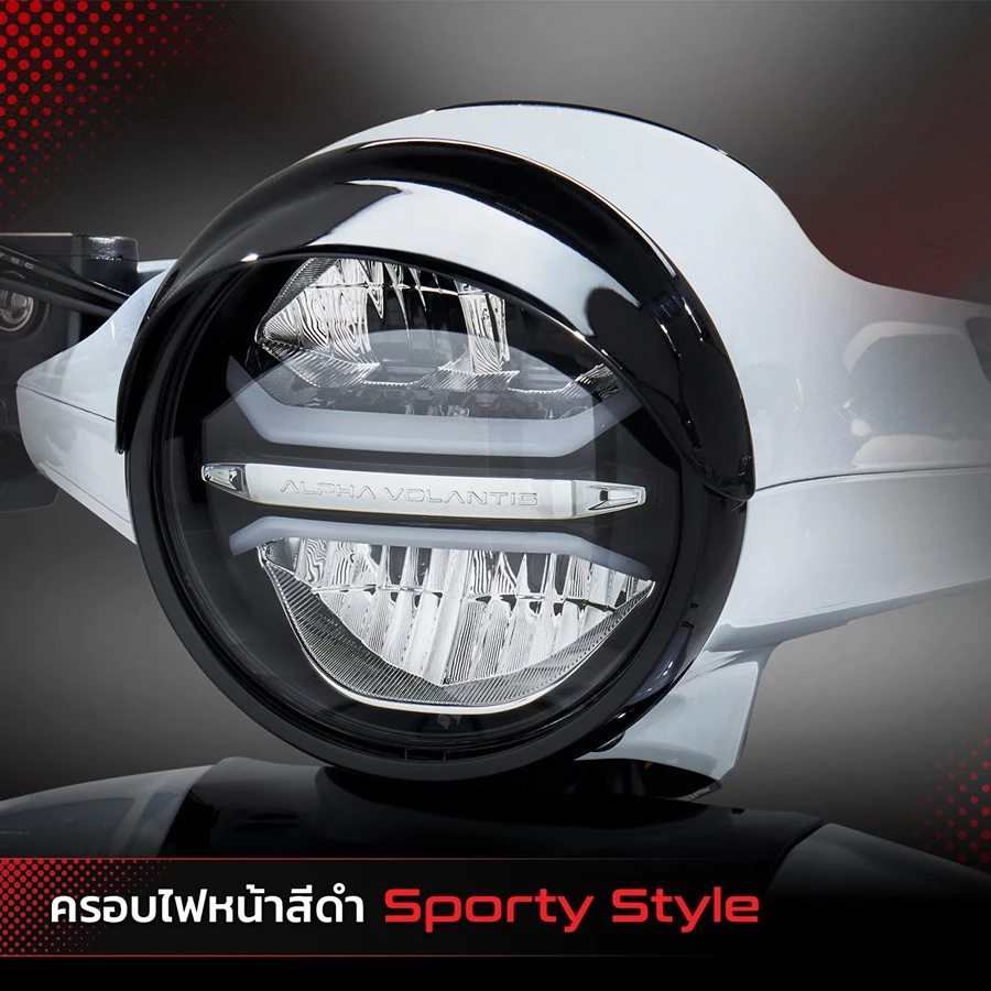 เริ่มกันที่ด้านหน้ากับ ครอบวงไฟหน้าที่มาพร้อมกับหมวกไฟหน้า (Ring Cover With Head Light Cap) สีดำโค้งมนช่วยกันแสงไฟหน้ารถขณะขับขี่ไม่ให้สะท้อนขึ้นมาระดับสายตาแถมยังเพิ่มความสปอร์ตดูดีมีมิติให้กับตัวรถ ถัดมากับชุดครอบแตรพร้อมฝาครอบสีดำ (Front Panel Cover) เสริมให้ดู เท่ น่าค้นหา พร้อมช่องดักลมด้านหน้า (Front Air Inlet) สีแดง (Alpha Red) เพิ่มลูกเล่นความสปอร์ตแฝงไปกับชิ้นงานได้อย่างลงตัว