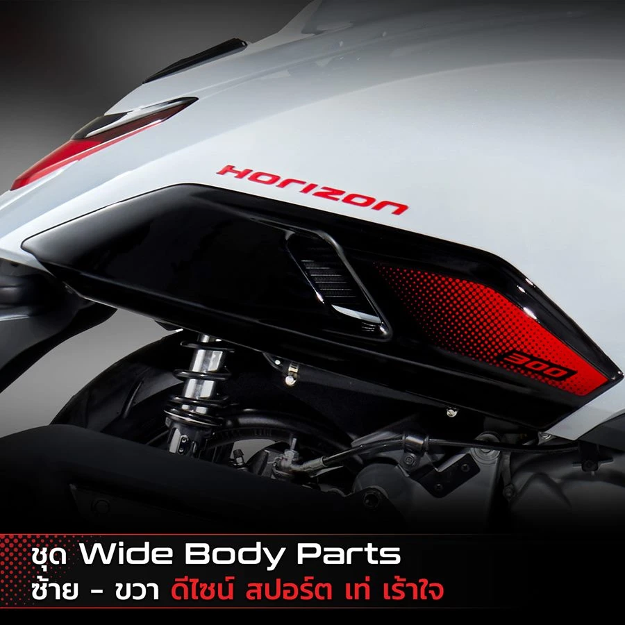 และยังมาพร้อมกรอบครอบไฟท้ายสีดำ (Cover Tail Lamp) ตัดกับไฟท้าย LED สีแดง เพิ่มความเท่ไม่เหมือนใคร ถัดมากับ Parts ใหม่ที่เกี่ยวข้องกับเรื่องของ หลักอากาศพลศาสตร์ (Aero Dynamics) Horizon 300 Strike Edition ประกอบไปด้วยช่องดักลมขนาดใหญ่ทั้งซ้ายและขวา (Side Air Vent)