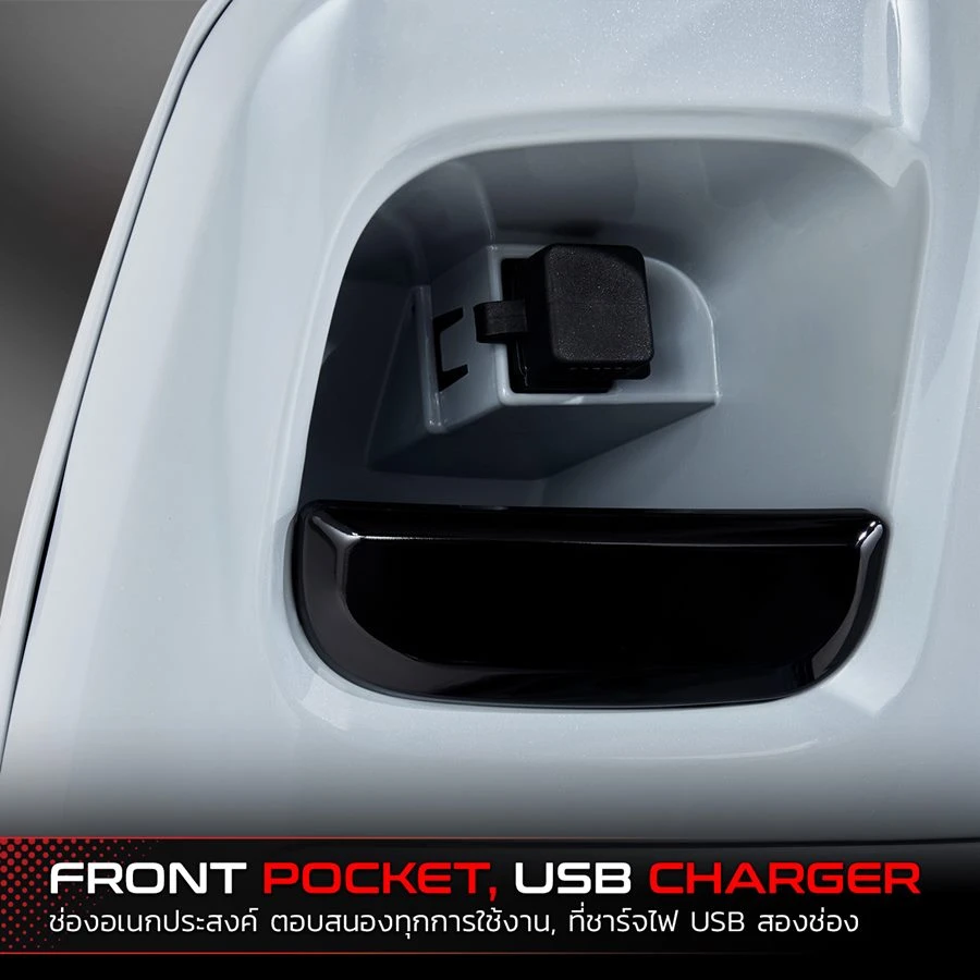 นอกจากนี้ยังเพิ่มฝาครอบเรือนไมล์ Full Digital แบบ LCD สีดำ (Ring Lens) สีดำ Piano Black ที่โดดเด่น สามารถแสดงผลได้อย่างครบครัน ปรับความสว่างได้อย่างอัจฉริยะทั้งกลางวันและกลางคืน แถมยังเพิ่มที่ครอบกล่องเก็บของสีดำด้านหน้า (Front Pocket) อีกทั้งยังมีช่องเก็บของอเนกประสงค์ด้านหน้าคนขับ ที่มีพอร์ตชาร์ตไฟอเนกประสงค์แบบ USB ถึงสองช่องสะดวก ง่าย ต่อการใช้งาน และกล่องเก็บของใต้เบาะที่สามารถเก็บของใช้ได้อย่างสะดวกสบาย