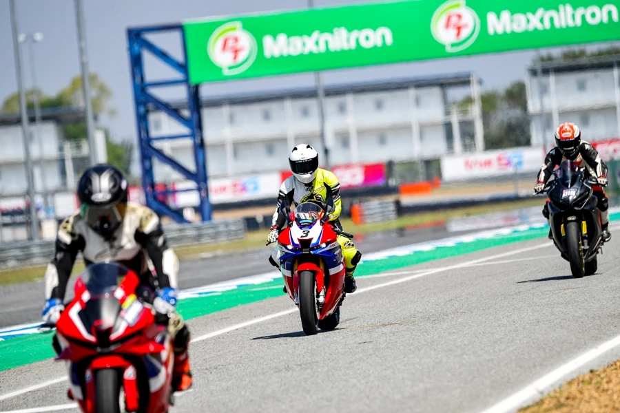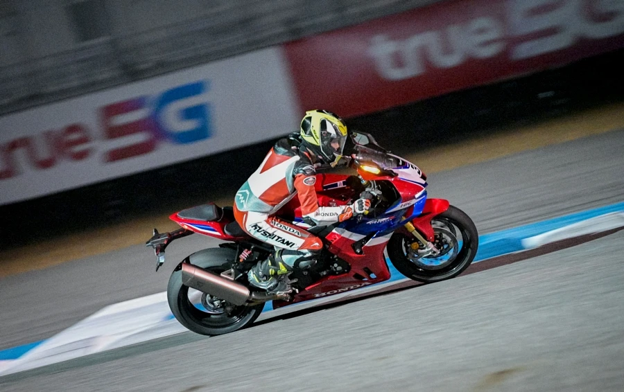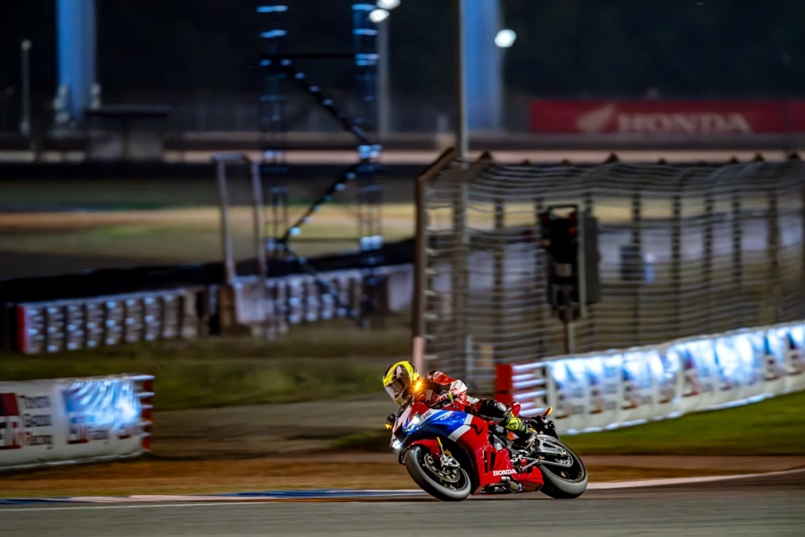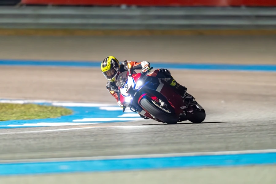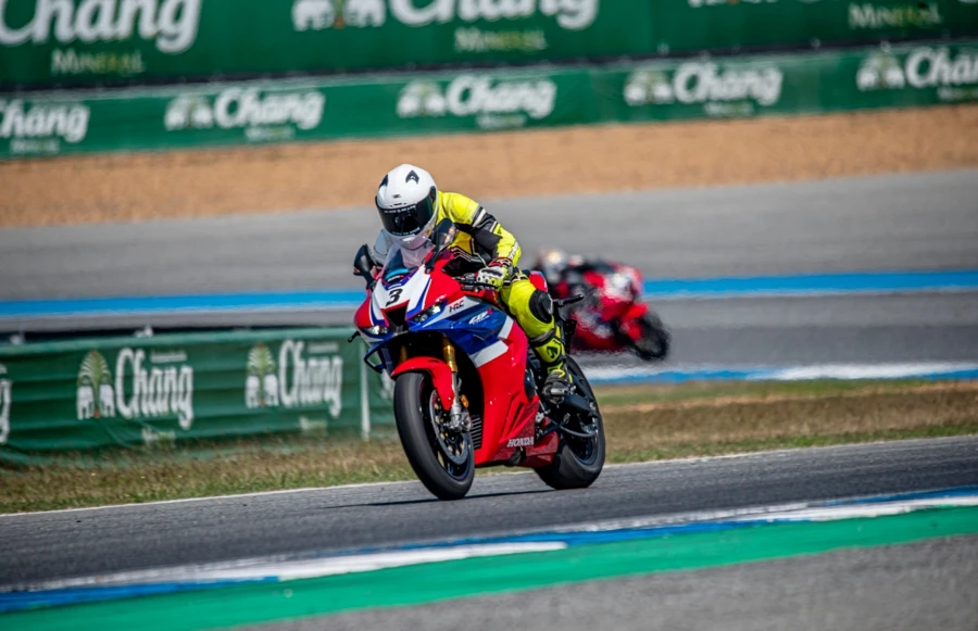 การขี่ทดสอบครั้งแรก CBR1000RR-R FIREBLADE SP ใหม่ นับเป็นครั้งแรกในไทยนับตั้งแต่เปิดตัว แม้เป็นรถที่เคลมได้ทั้งขี่ถนนและแทร็ค แต่การทดสอบสมรรถนะให้ได้ดีที่สุดก็ต้องเป็นในแทร็คอย่างสนามช้างอินเตอร์เนชั่นแนล การขี่วันแรกเริ่มในช่วงเย็นแบ่งออกเป็น 2 เซสชั่น มีเวลา 10 นาทีต่อเซสชั่น ช่วงแรกผู้เขียนที่มีเวลาเตรียมตัวไม่นานกับไนท์รัน สำหรับสถานการณ์แบบนี้ควรใช้ชิลด์หน้าแบบใสและมีเทียร์ออฟเพื่อการมองเห็นที่ชัดเจนและลอกแมลงที่บินมาติดด้านหน้าชิลด์ได้สะดวก เชสชั่นนี้เป็นการขี่แบบทำความคุ้นชินกับตัวรถไม่ว่ามิติ ท่านั่ง และคาแรคเตอร์การทำงานของเครื่องยนต์ ตลอดจนระบบช่วยเหลือต่างๆ โชคดีที่ทางทีมงานไทยฮอนด้าได้เซ็ตติ้งการเซอร์วิสการขี่ทดสอบครั้งนี้เสมือนการแข่งขันมีผ้าห่มวอร์มยาง และทีมงานพร้อมทุกอย่างเพื่อให้รถแสดงสมรรถนะออกมาได้ดีสุด ในเซสชั่นที่ 2 ผู้เขียนเริ่มคุ้มชินกับตัวรถมากยิ่งขึ้น เริ่มทำความเร็วได้อย่างที่ต้องการมากขึ้น ขี่ด้วยความมั่นใจ ระบบเบรกที่ลองทั้งชะลอเบาในหลายๆ โค้งให้ฟิตแบคที่ดีมากๆ ตัวรถนิ่งและทำให้เดินคันเร่งเข้าโค้งได้อย่างสมูธ การเร่งออกจากโค้งทำได้ดีเช่นกันกับเทคโนโลยีใหม่ การลองเร่งเปิดออกจากโค้ง 3 ขณะรถยังทำมุมลีนอยู่พบว่ายางด้านหลังมีอาการสไลด์แต่ระบบช่วยเหลือต่างๆ ก็ทำงานสอดประสานจนทำให้ประคองแก้รถกลับมาตรงแล้วเร่งต่อได้ทันใจ จนจบเซลชั่นด้วยการทำเวลาเร็วต่อรอบได้ต่ำกว่า 2 นาที ต้องยกให้ CBR1000RR-R FIREBLADE SP ใหม่ ที่ขี่แรง นิ่ง และง่ายต่อการควบคุม