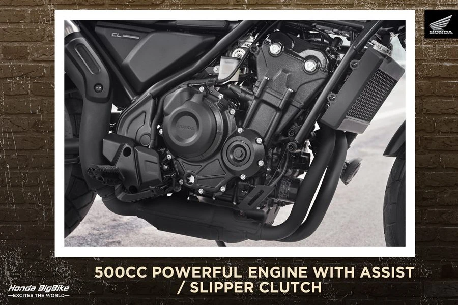 New Honda CL500 ขุมพลัง 500 ซีซี เร้าใจทุกเส้นทางด้วยระบบระบายความร้อนด้วยน้ำและแอสซิส สลิปเปอร์คลัตช์ ขับขี่นุ่มนวลพร้อมสมรรถนะเหนือชั้น โดดเด่นด้วยโช้กอัพหน้า 41 มม. พร้อมยางหุ้มสไตล์คลาสสิก ระยะยุบ 150 มม. ซับแรงกระแทกได้เต็มพลัง