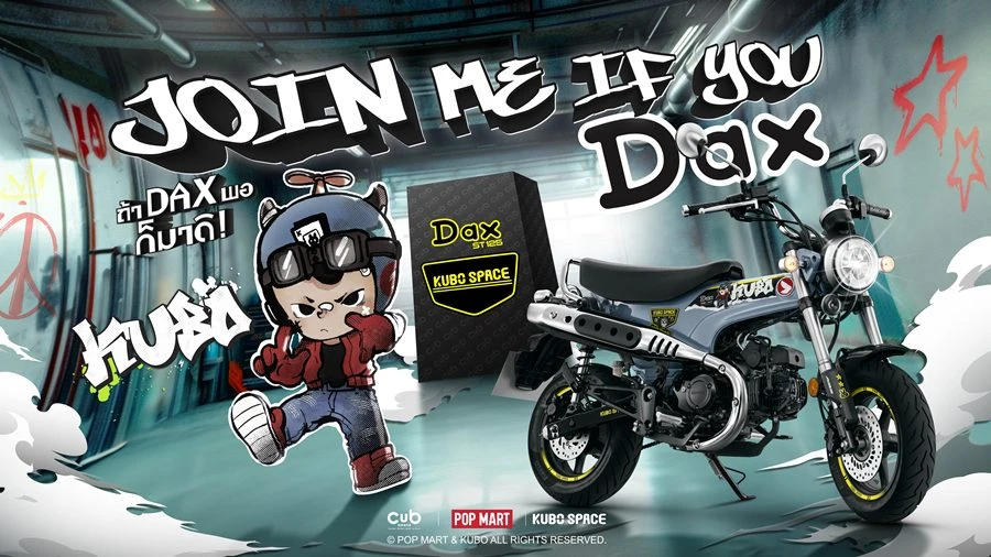 Join Me If You Dax ถ้า DAX พอก็มาดิ!’ ตัวรถผสานความคราฟต์และความเป็นอาร์ตทอยของ KUBO โดดเด่นด้วยกราฟิกเรืองแสงในที่มืดเผยตัวตนความเป็น DAX และ KUBO ได้อย่างลงตัว พร้อมซีเรียลนัมเบอร์บนตัวรถไม่ซ้ำใคร เป็นที่สุดของความแรร์ ผลิตจำนวนจำกัดเพียง 300 คัน เท่านั้น ทั้งนี้ มาพร้อม Premium Set เอาใจผู้ชื่นชอบอาร์ตทอยซึ่งประกอบด้วยฟิกเกอร์ KUBO ดีไซน์พิเศษพร้อมซีเรียลนัมเบอร์เลขเดียวกับตัวรถ มาในไซส์สุดเอกซ์คลูซีฟ 35 CM. รวมถึงเสื้อฮู้ดดี้ DAX KUBO LIMITED HOODIE และหมวกกันน็อก DAX KUBO LIMITED HELMET โดย
